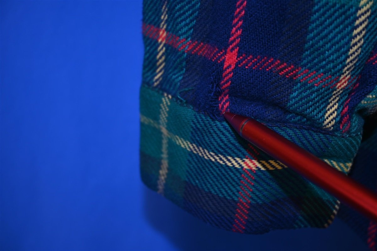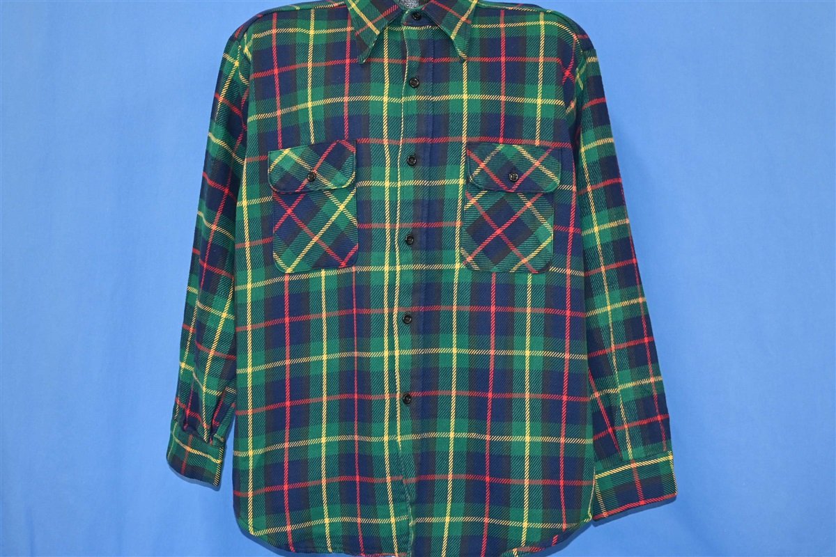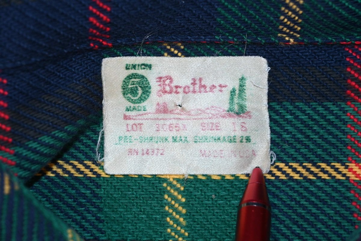 This awesome button down was made back in the 60s, and it features a wonderful plaid pattern that includes rich shades of green, blue, red, and yellow. This shirt was made by the brand Five Brother, and it is a cozy cotton flannel that features two button flapped chest pockets.