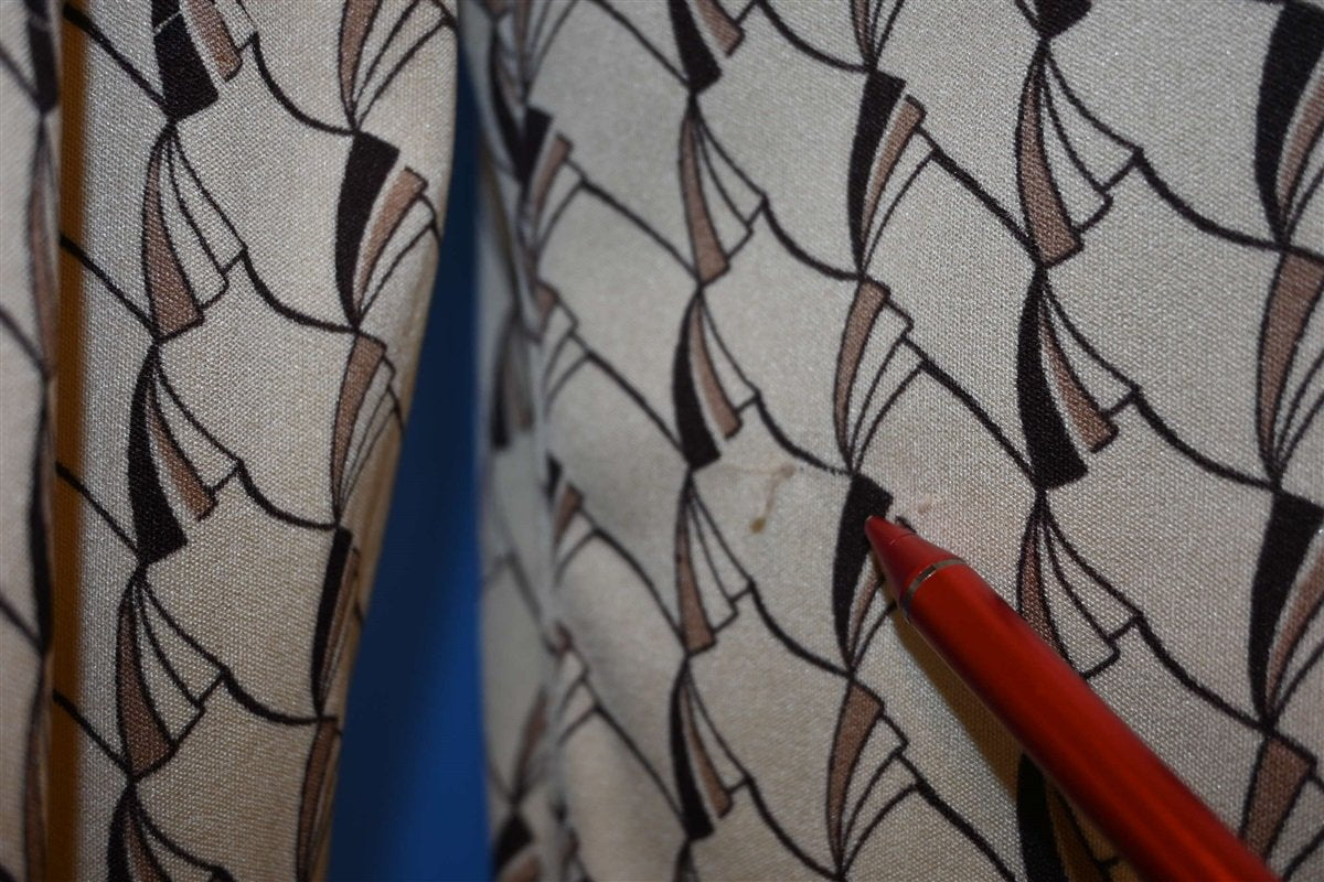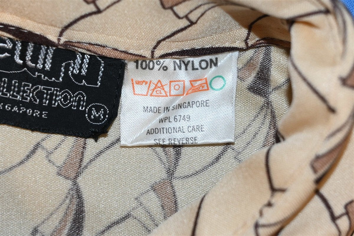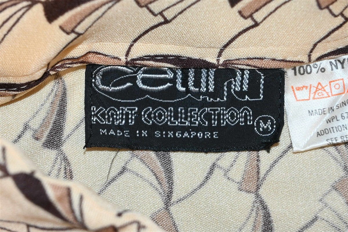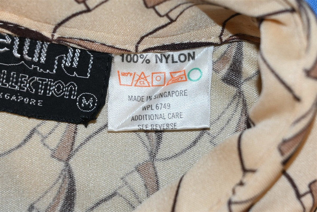 This awesome button down is an authentic disco shirt that was made in the 70s by Cellini. The shirt sports a classic 1970s style big collar and it's made from a sleek and silky nylon fabric. This shirt comes in a light shade of beige with an intricate geometric pattern that sits diagonally across the shirt.