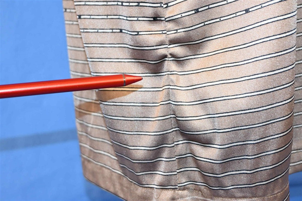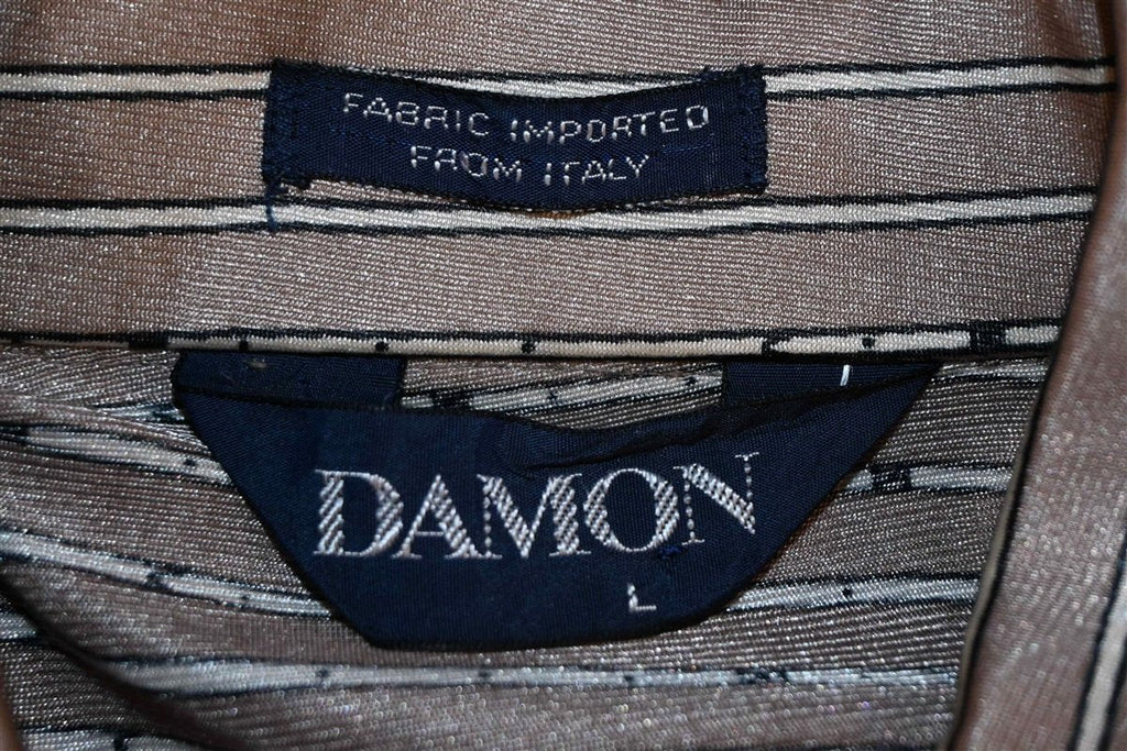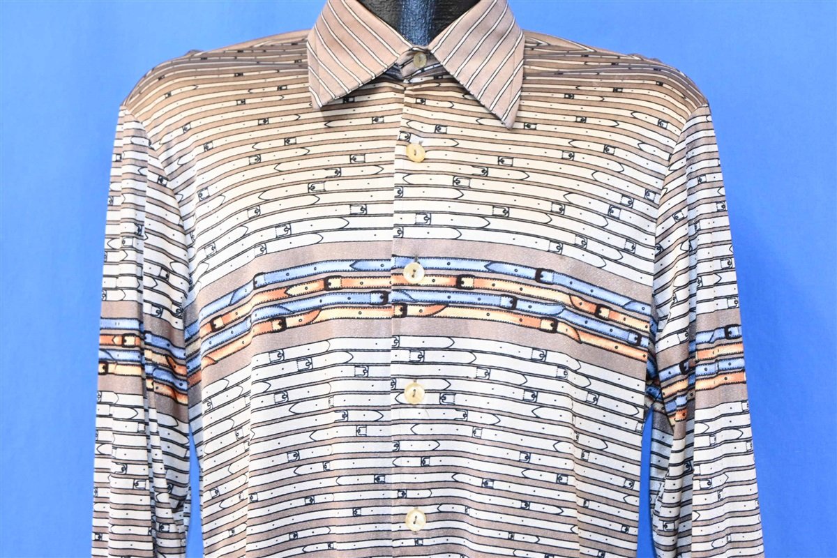 This cool button down is a disco shirt that was made by the brand Damon in the 70s. The shirt features a unique all over print pattern of buckled belts, and the belts create a horizontal striped design that has a fun and interesting twist. This shirt is made from a sleek nylon material and it has the sort of big style collar that was popular during the 70s.