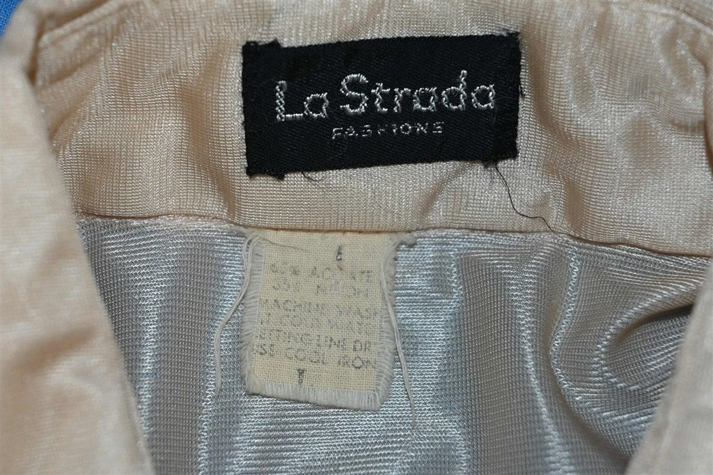 This awesome button down is an authentic disco shirt from the 1970s. It was made by the brand La Strada and features a 70s style big collar. This shirt is made from a sleek and silky synthetic material, and features a brown and beige geometric design. Striking geometric patterns like this were quite popular in the 70s thanks to the Art Deco revival, which began in the late 60s. This design movement put a spotlight on stylized, geometric graphics that were often simplistic yet stylishly bold.