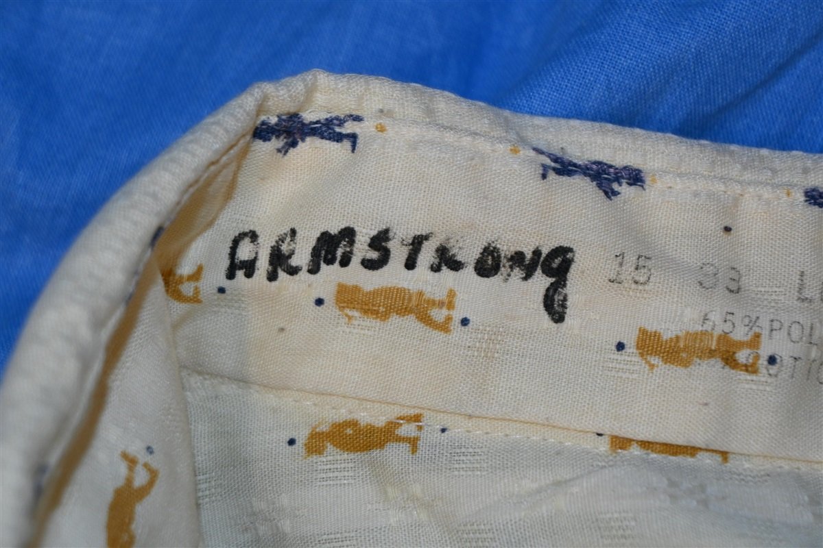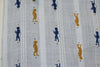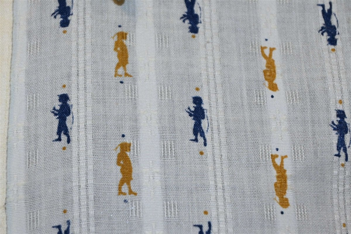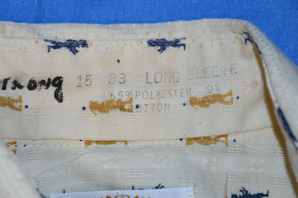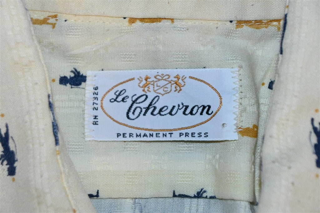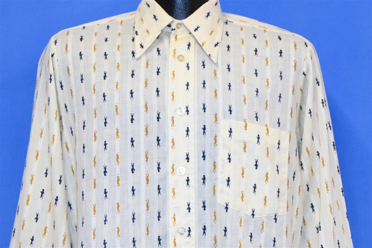 This sweet 70s disco shirt was made by Le Chevron, and it features a soft cotton blended material and single chest pocket. The shirt comes in a pale yellow color and features a unique pattern that appears to be small silhouetted figures. Behind these tiny figures, the shirt also has a subtle vertical striped design incorporated into the weave of the fabric.