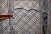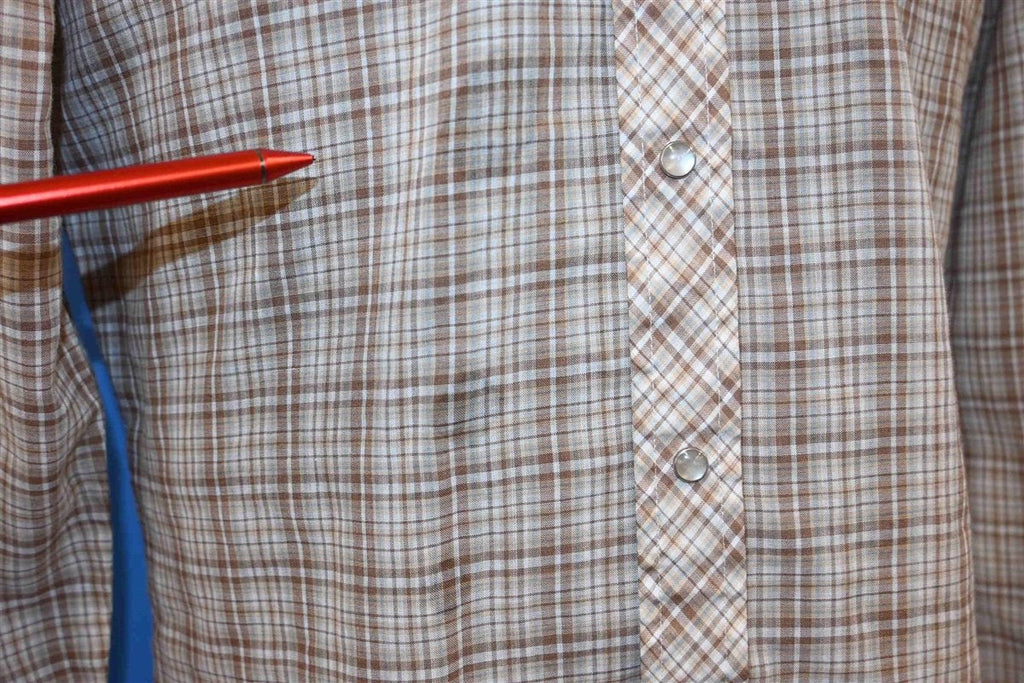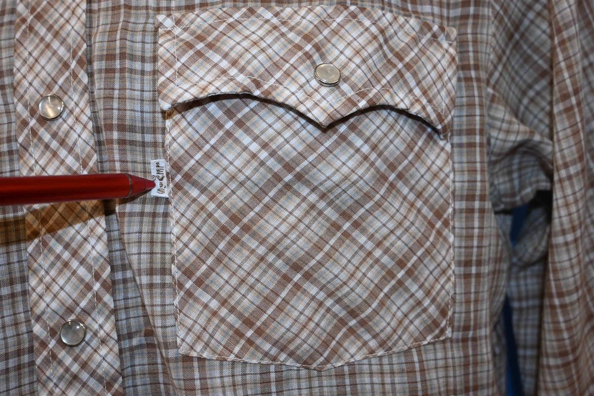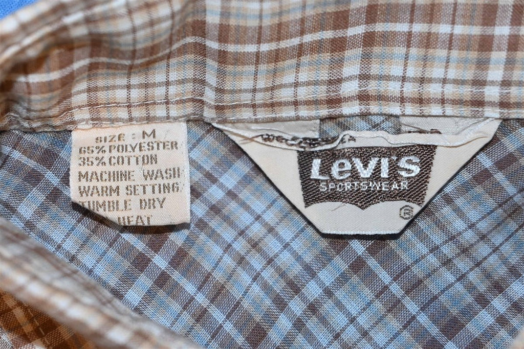 This stylish western shirt was made by Levi's and it features the company's white tab tag on the pocket. This tag has a capitalized E, a stylistic choice that the brand eventually phased out over the years. This shirt also has a brown plaid pattern and a scalloped yoke on the front that matches the scalloped flaps on the chest pockets.