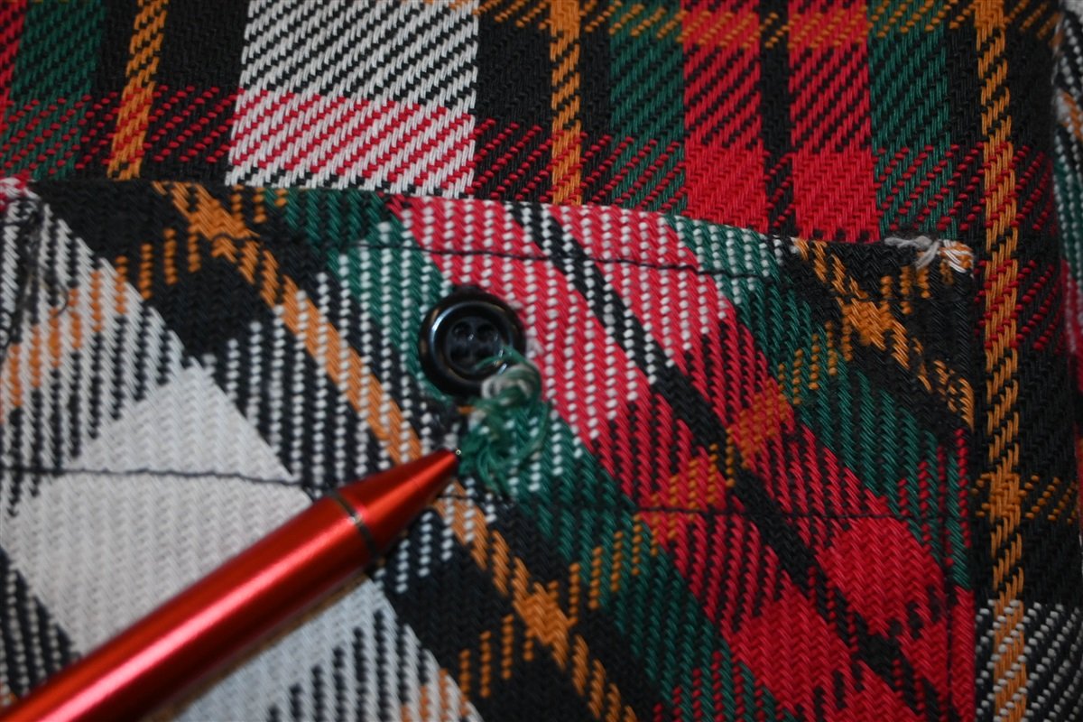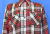 This awesome flannel was made back in the 70s by a brand called Mr. Leggs. While this brand used to be known for their stylish slacks, they also produced some sweet button downs like this one. The shirt features a colorful plaid pattern that includes shades of red, green, and off-white. It also has two chest pockets with button closures.