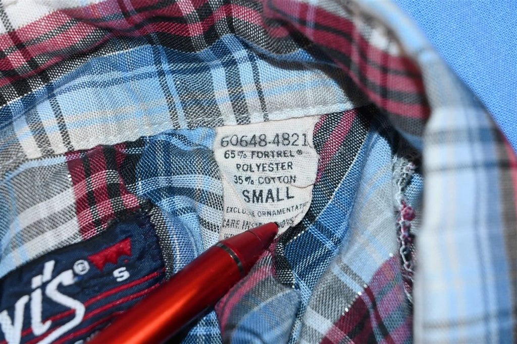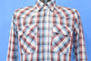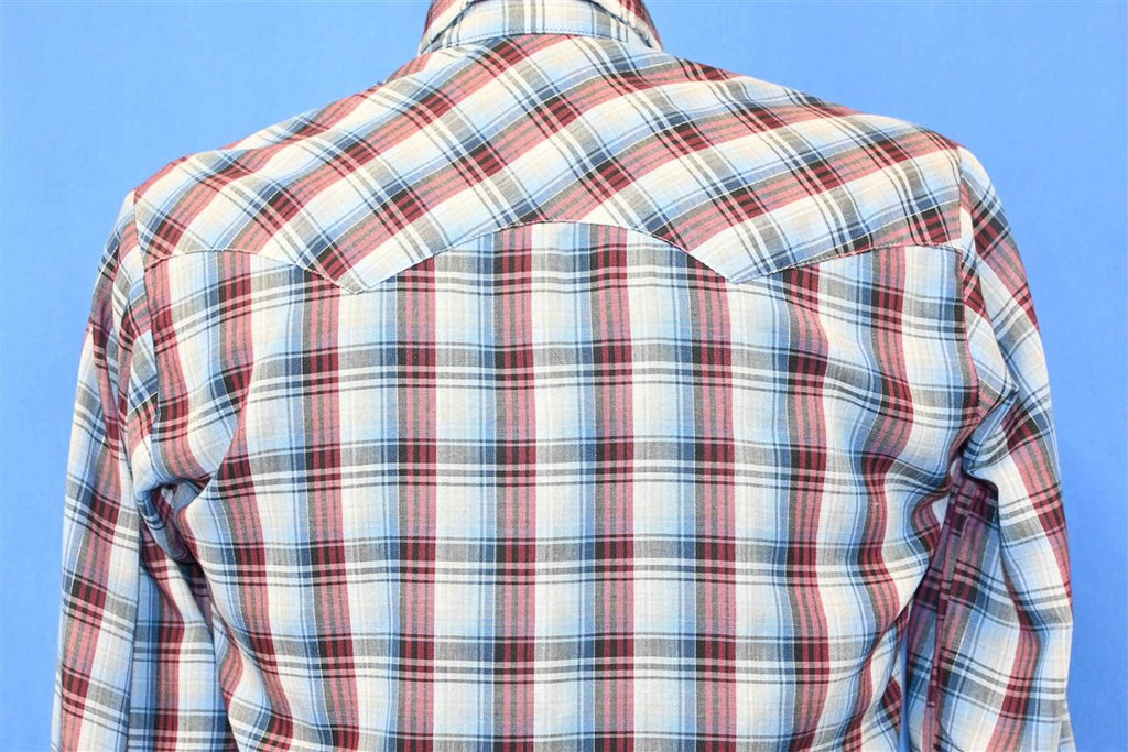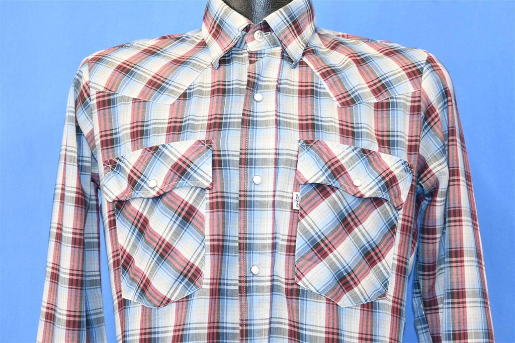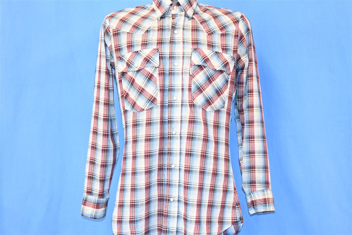 80s Levi's Red Blue White Plaid Western Pearl Snap Shirt Small