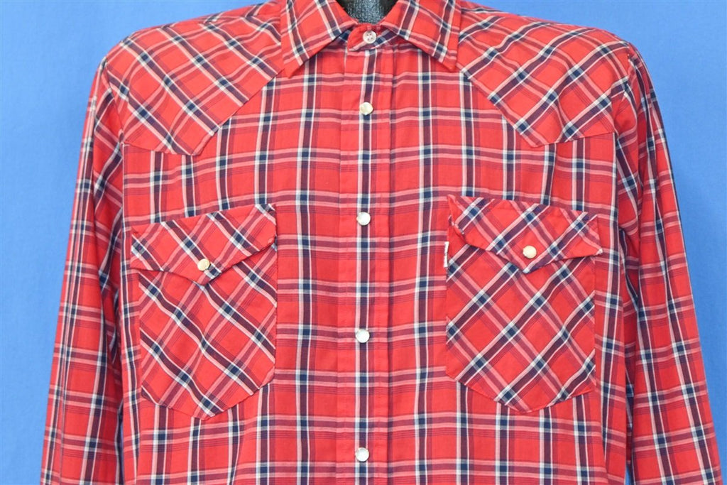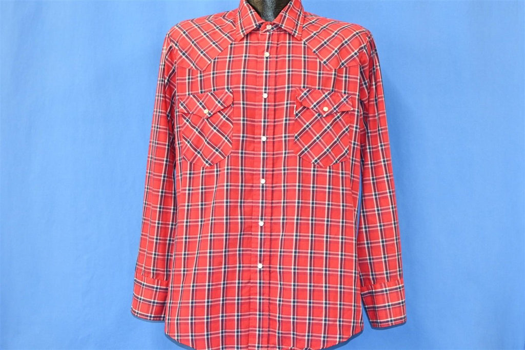 80s Levi's Red Plaid Western Pearl Snap Cowboy Shirt Large