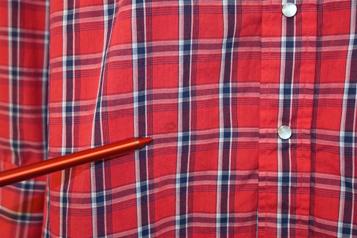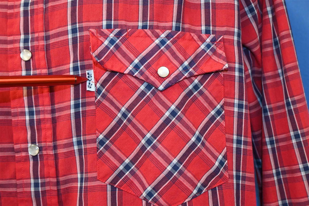 This stylish western shirt was made back in the 80s by Levi's and it features the famous Levi's white tab tag on the pocket. This shirt has two flapped chest pockets and pearl snap closures. The shirt comes in a vibrant red with a multi-colored plaid pattern.