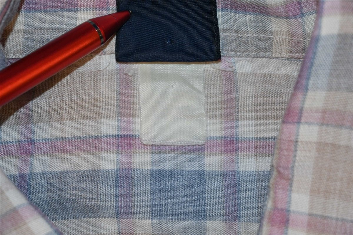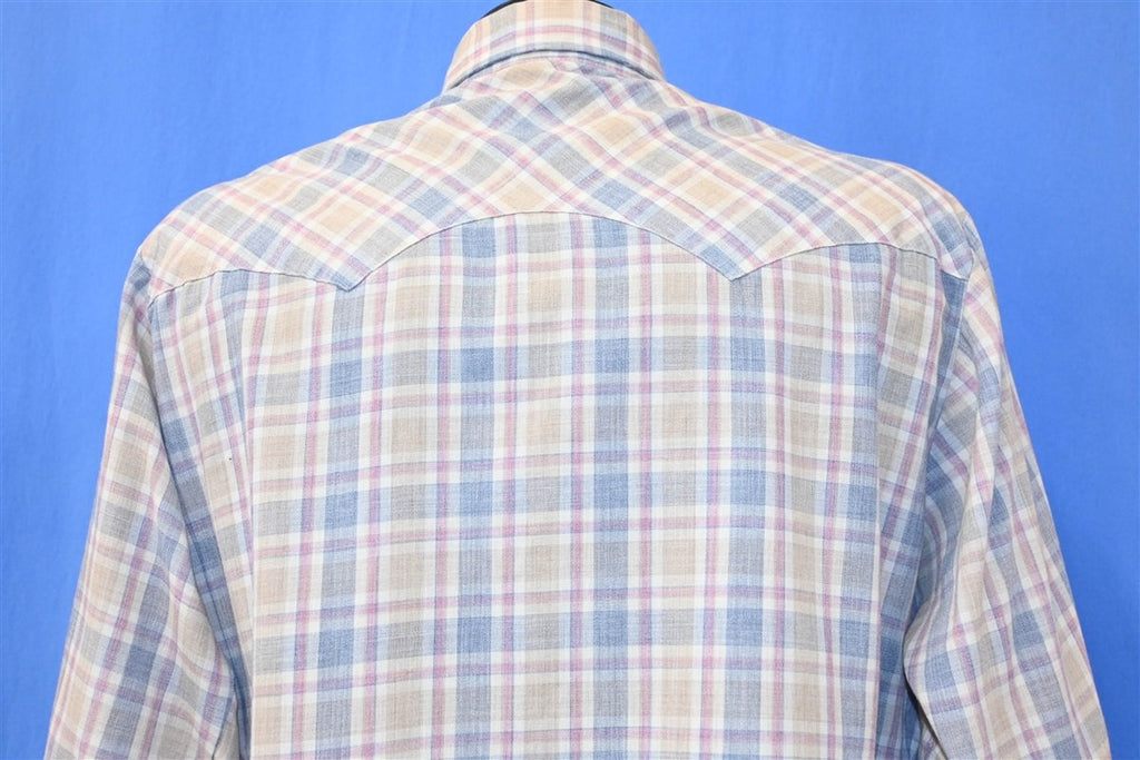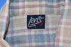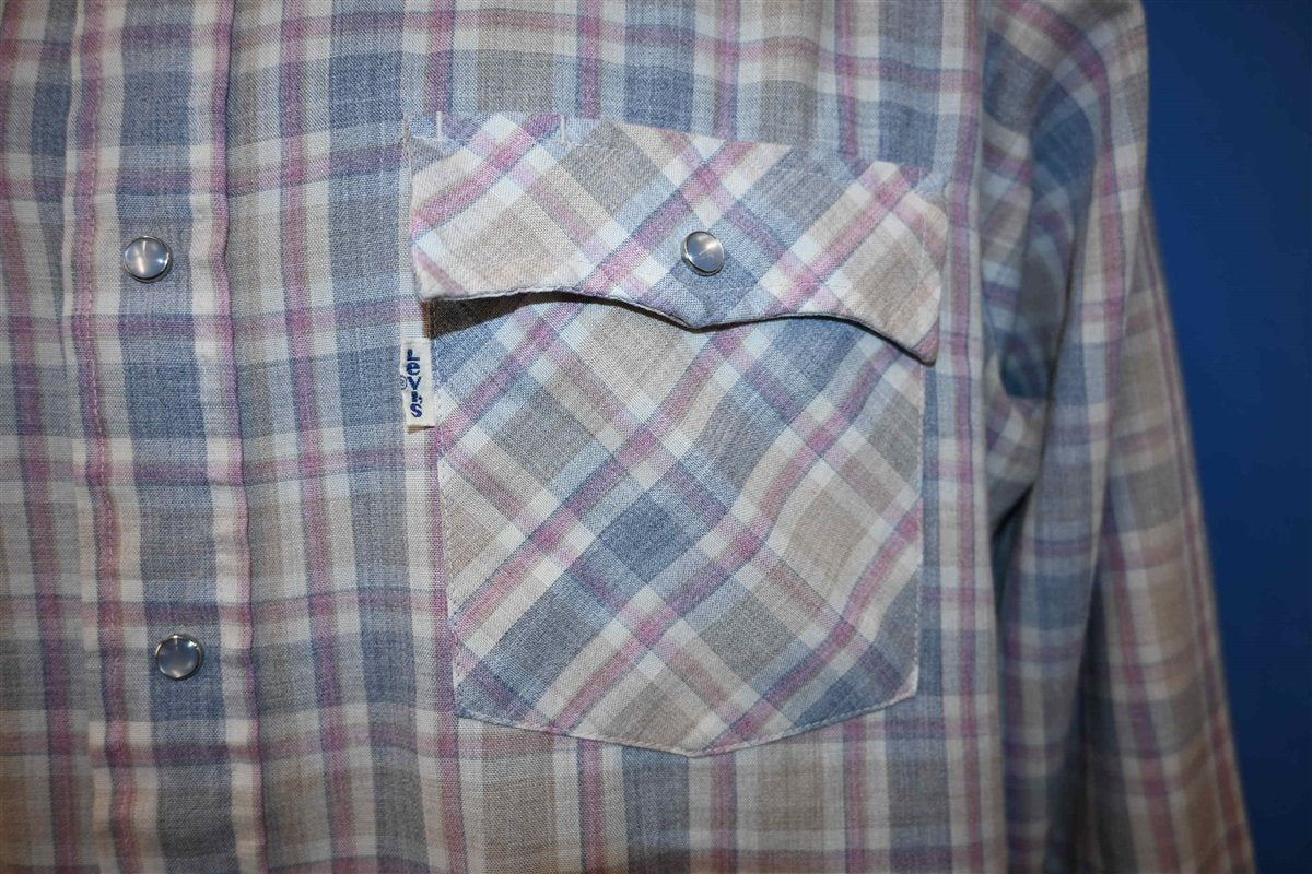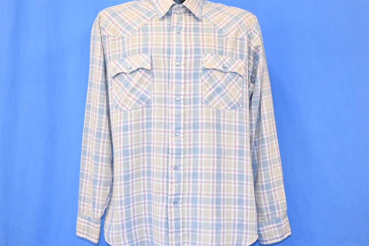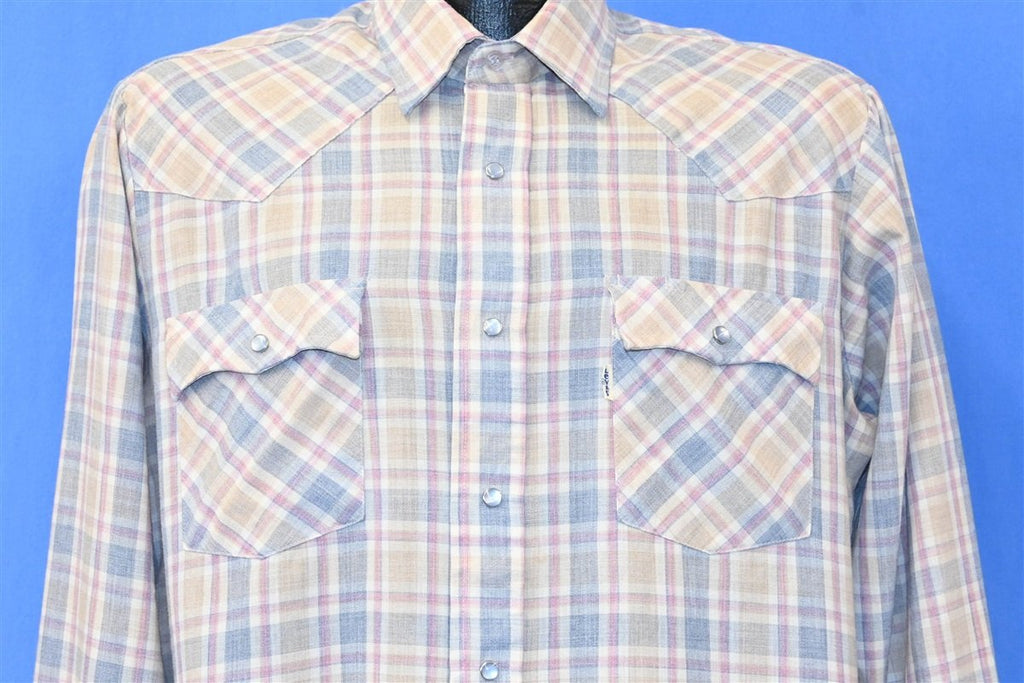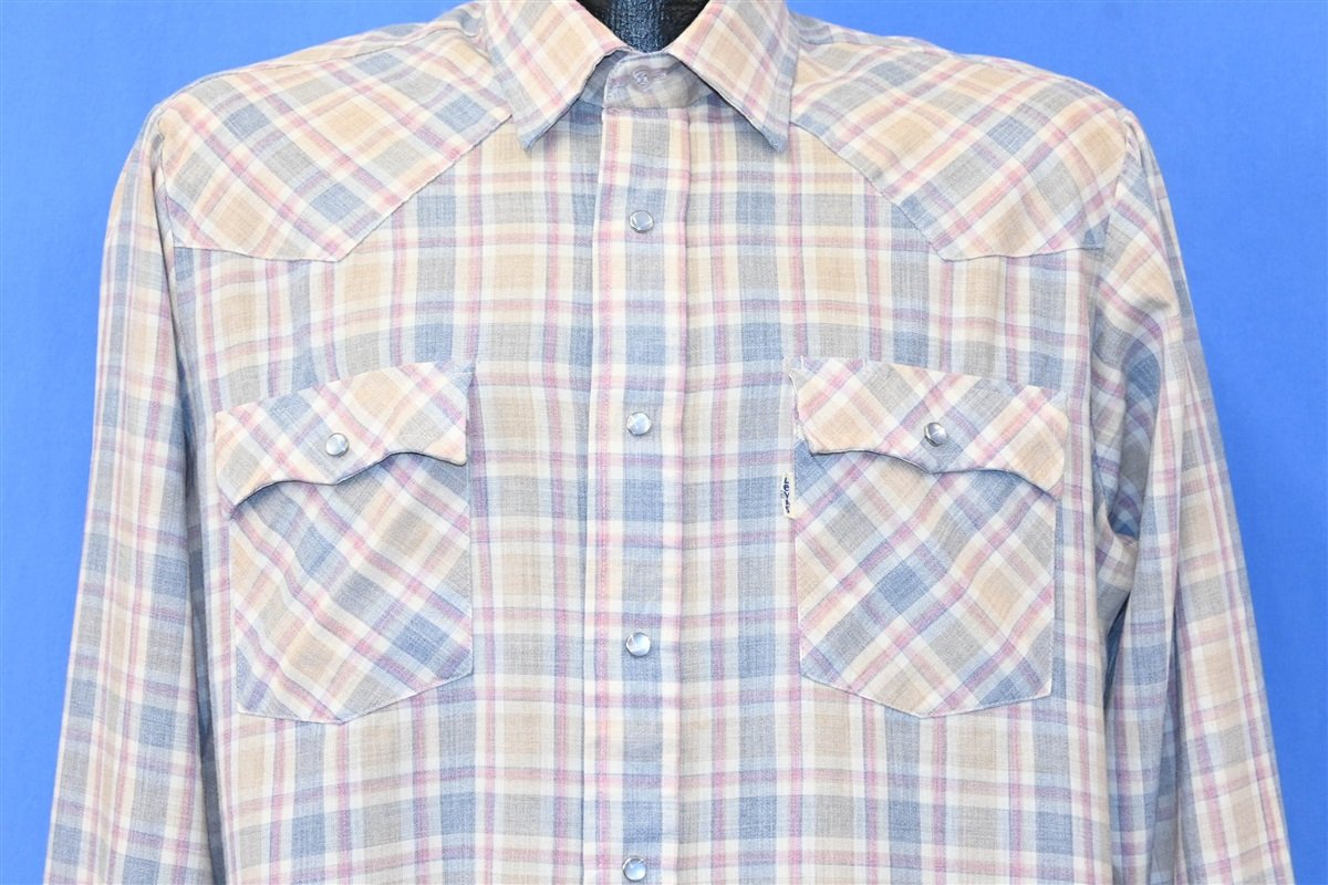 This wonderful western cowboy shirt was made by Levi's, and it features their famous white tab tag. The shirt is decorated in a plaid pattern that has pastel shades of blue, yellow, and red. This shirt also has pearl snap closures and western style yokes on the front and back.