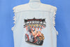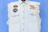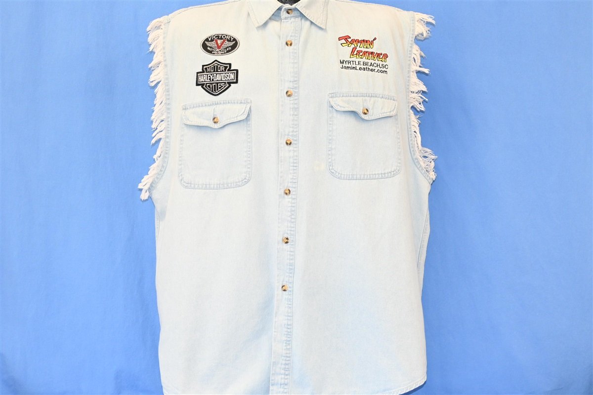 This sweet button down shirt is a cool piece of biker-inspired fashion from the 90s. This shirt was made for Jamin Leather, a leather goods and apparel store that has been catering to the local Myrtle Beach biker community since 1995. This shirt is made from a soft chambray material and features cut off sleeves, giving it the look of a classic denim battle vest. Along with the Jamin Leather logo, the shirt features embroidered graphics for Harley-Davidson and Victory brand motorcycles. Meanwhile the back has an awesome image of a bikini-clad woman lounging on a chopper, with the caption "one hot piece of American steel".