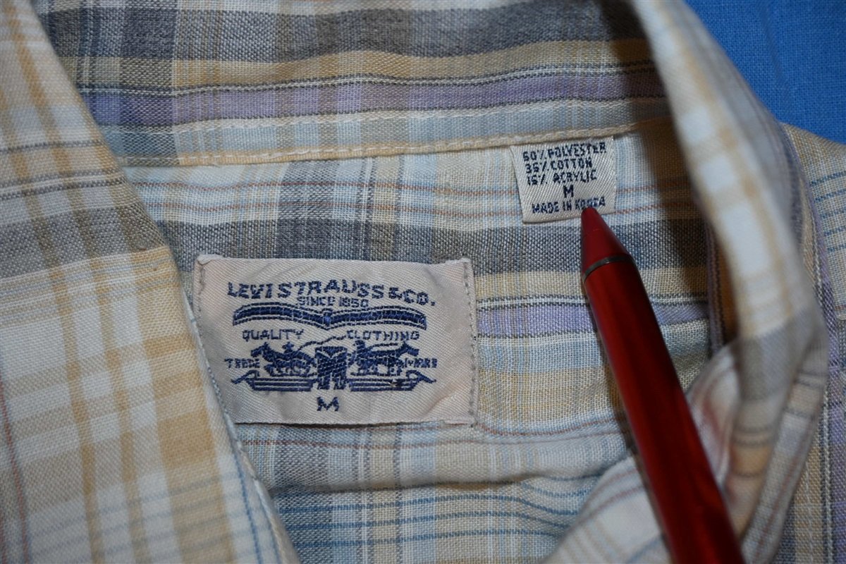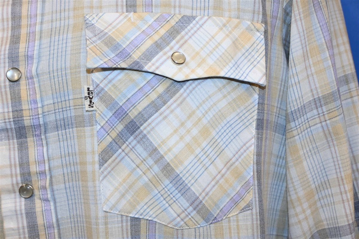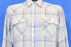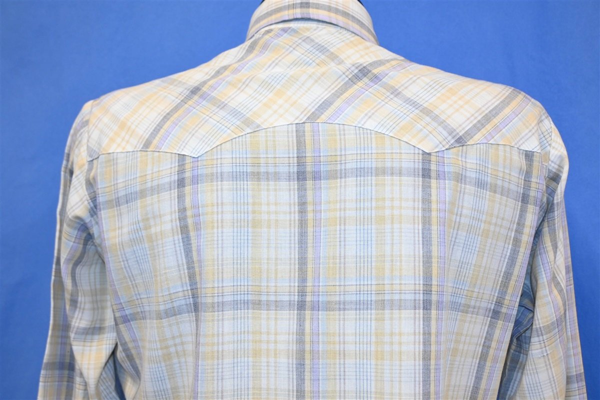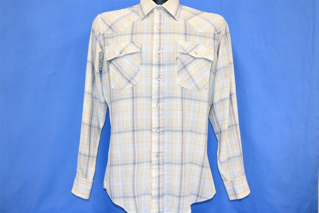This stylish cowboy shirt was made by the beloved denim manufacturer, Levi's. The shirt is made from a soft and lightweight, acrylic tri blend material, and it's been decked out in a multi-color plaid pattern featuring light shades of blue and yellow. This shirt includes details like western style yokes, flapped chest pockets, and pearl snap closures.