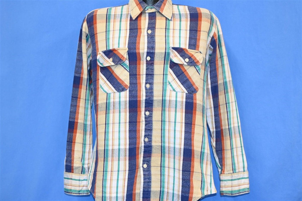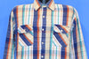 This colorful button down shirt is a vintage flannel from the brand VIP. This shirt was made in the 90s, when flannel was particularly popular thanks to the influence of alternative rock bands like Nirvana and Pearl Jam. The shirt features a cool plaid pattern with shades of blue, green, tan, and red. It also has two flapped chest pockets with button closures.