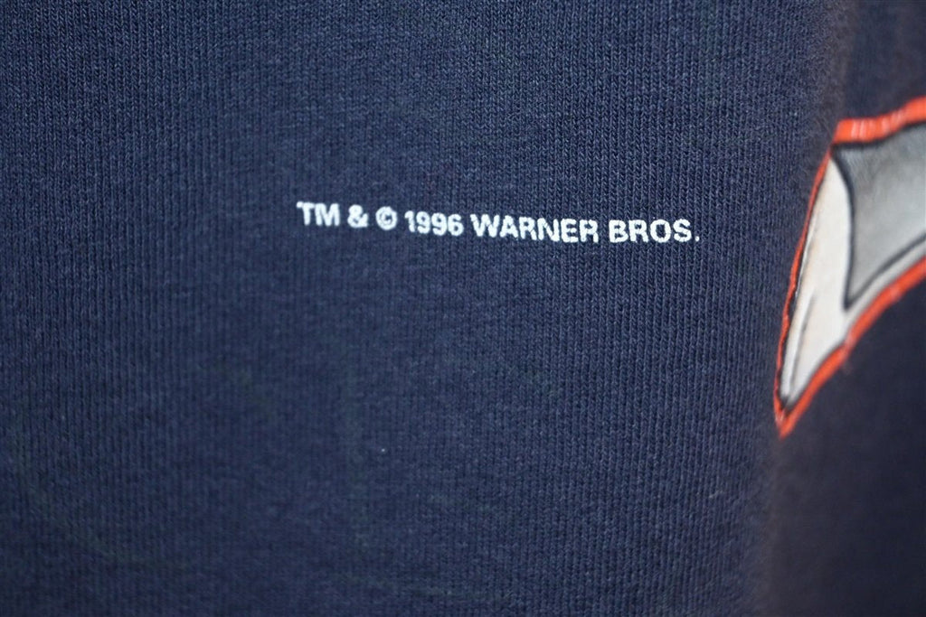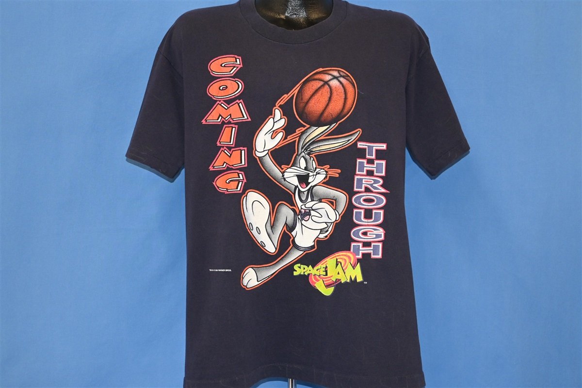 This awesome tee features Bugs Bunny of the Looney Tunes, and it was made to promote the 1996 sports comedy, Space Jam. This beloved family film utilized a combination of live action and animation to depict a story involving NBA superstar Michael Jordan playing basketball alongside the Looney Tunes. The movie's live action cast also featured several other notable NBA players of the 90s, including Muggsy Bogues, Shawn Bradley, Patrick Ewing, Charles Barkley, and Larry Johnson.