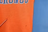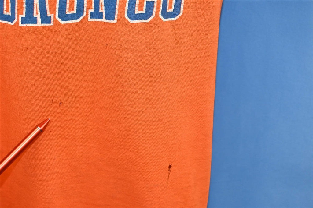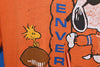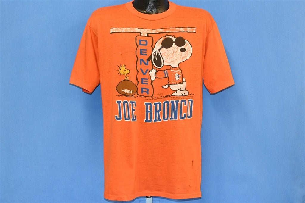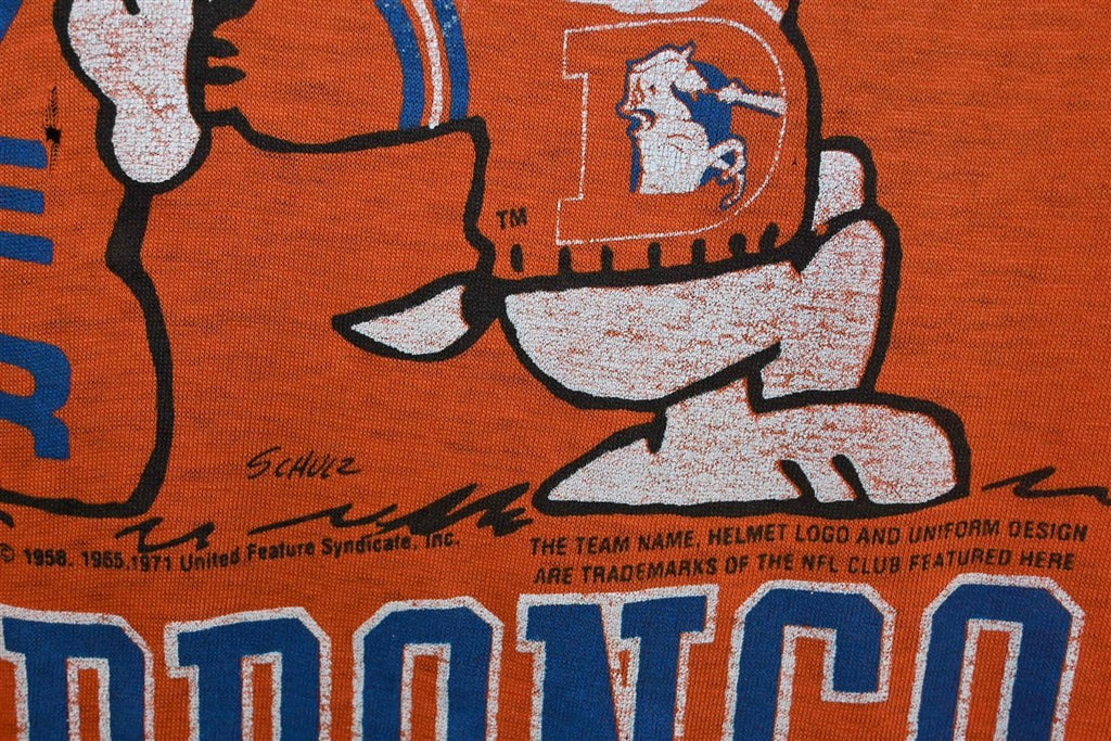 This sweet shirt reps the professional football team the Denver Broncos, and it also features Snoopy the beagle from Charles M. Schulz's beloved comic strip, Peanuts. Snoopy is shown with his best friend, Woodstock, and dressed like his alter ego, Joe Cool, although in this case he's Joe Bronco. This shirt was made in the 80s, after Dan Reeves became the youngest coach in the NFL. Under the leadership of Reeves, the team became perennial playoff contenders, and they earned three AFC championships during the latter half of the decade.