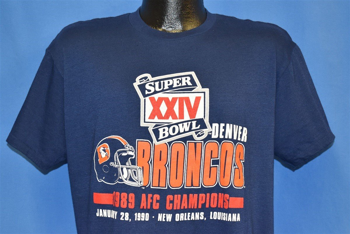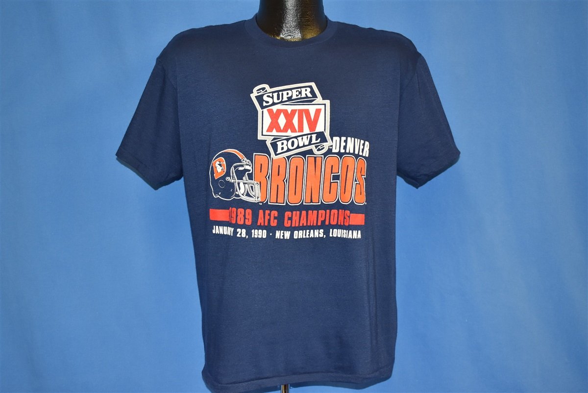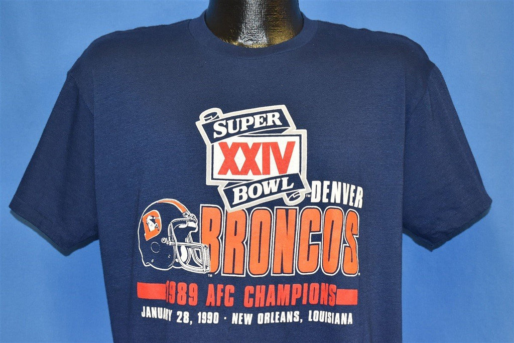 This vintage Super Bowl tee comes from the 1990 match-up of the Denver Broncos versus the San Francisco 49ers. The Broncos came into Super Bowl XXIV after defeating the Cleveland Browns at the AFC Championship. Their successful season was lead by quarterback John Elway,