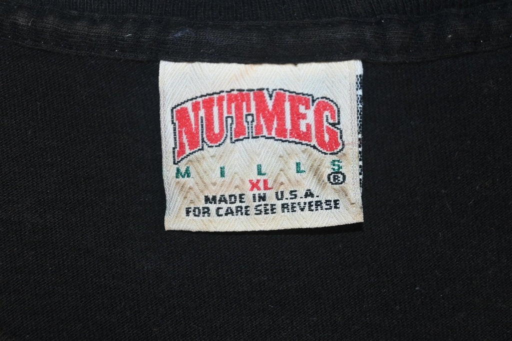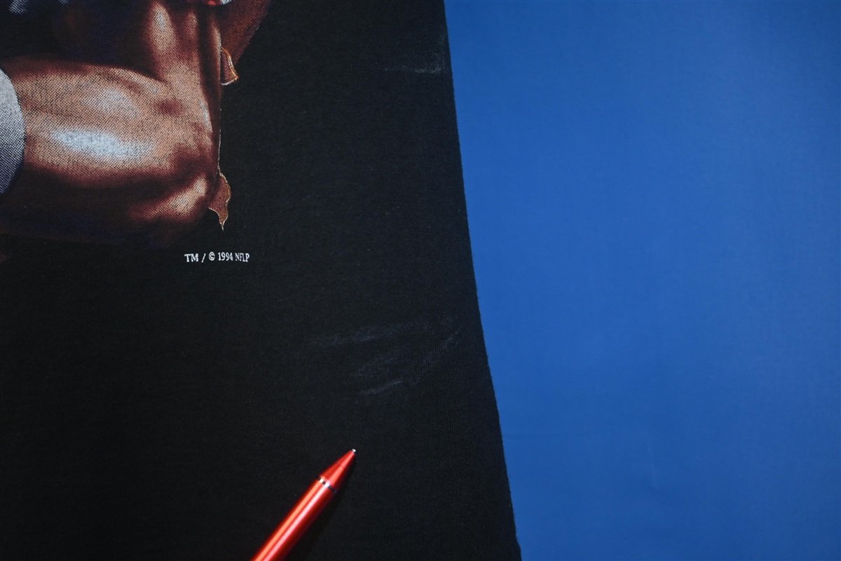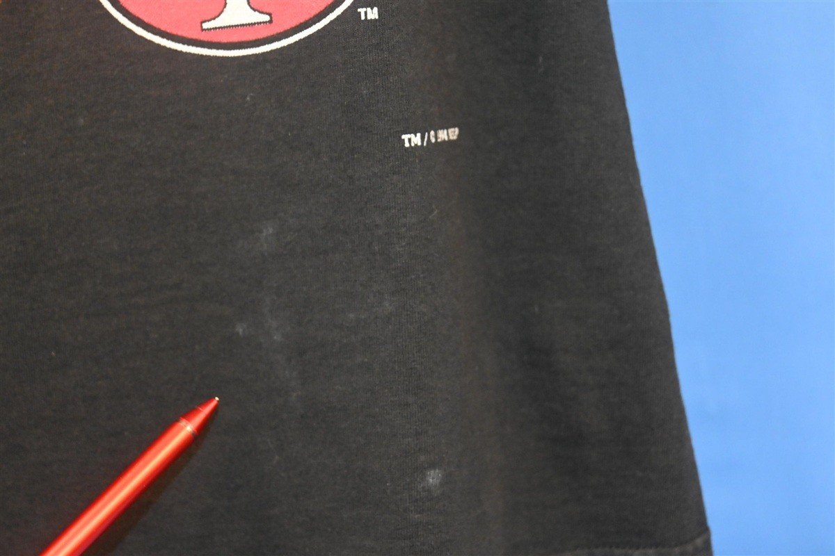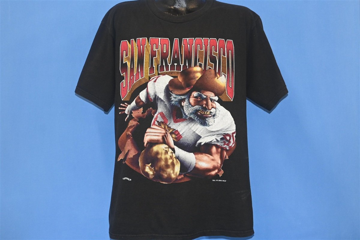 This awesome football tee reps the San Francisco 49ers, and it features double-sided graphics of their mascot, Sourdough Sam. This shirt is copyright 1994, which was the year that the Niners won Super Bowl XXIX against the San Diego Chargers. This was the team's first Super Bowl without star quarterback Joe Montana, but Montana's absence allowed Steve Young to finally step out from his predecessor's shadow.