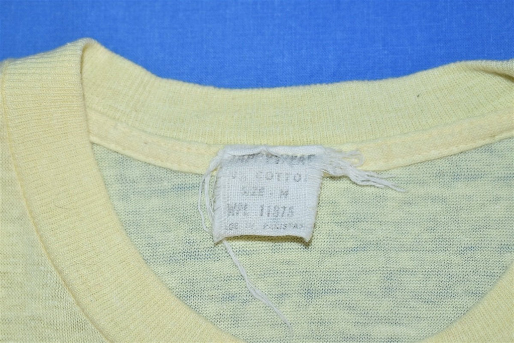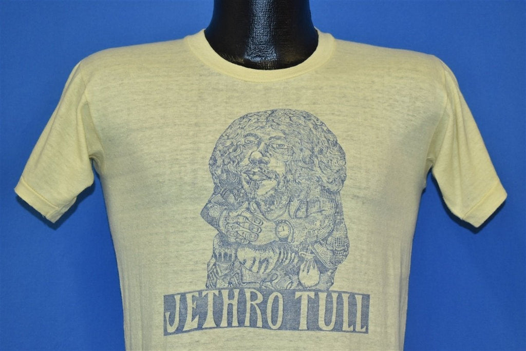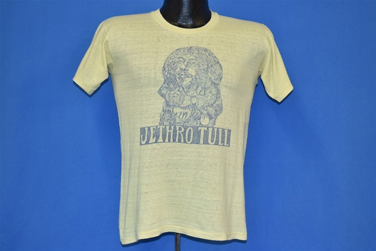 This awesome vintage rock tee is from all the way back in the 60s and is for the band Jethro Tull. The shirt bears one of the same woodcut images used for the cover of the group's album Stand Up. Stand Up was the band's second studio album, and the cover was designed by wood carver James Grashow, who followed the band around for a week so that he could properly capture the likeness of members Ian Anderson, Martin Lancelot Barre, Glenn Cornick, and Clive Bunker. Originally the cover to the album opened up like a children's pop up book so that a cut out of the band would stand up much like the title evoked. The design won the 1969 New Musical Express's award for best album artwork.