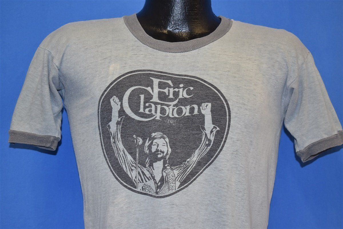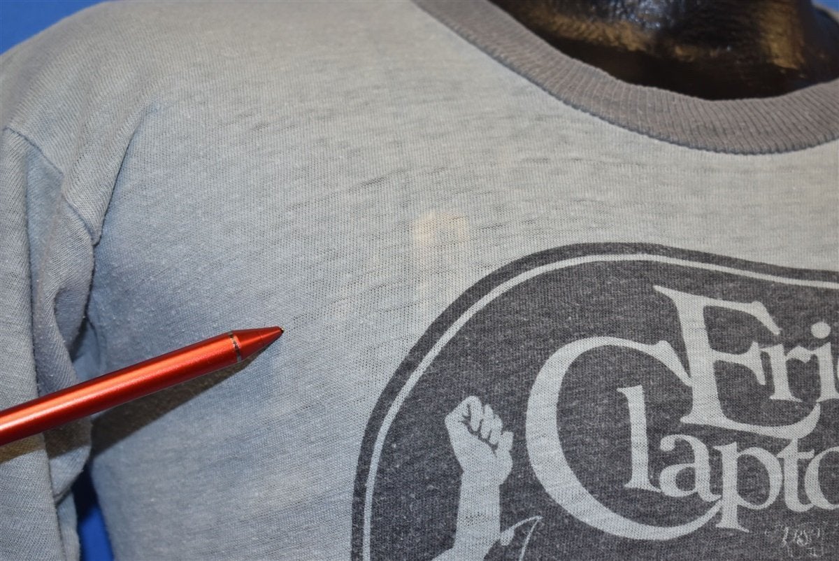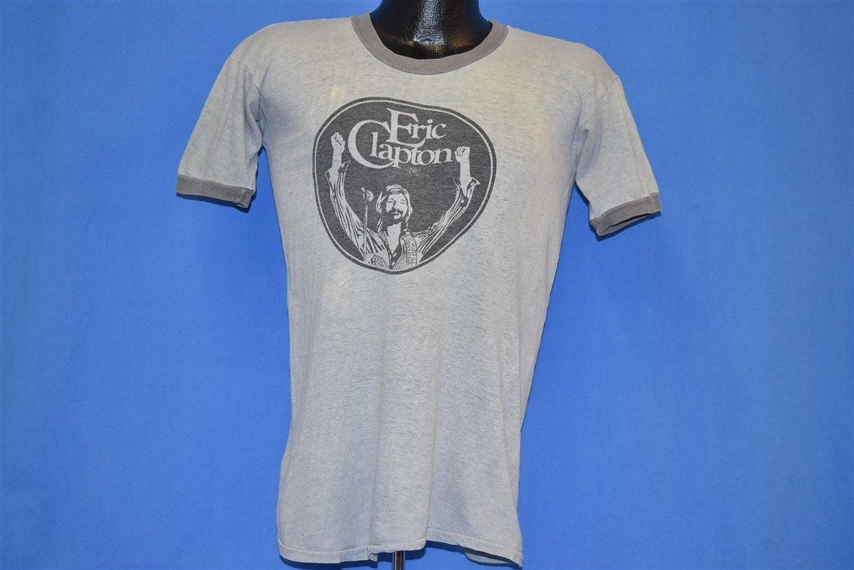 This awesome ringer t-shirt is for the legendary guitarist Eric Clapton. The shirt was made in 1975, the year that Clapton released his third studio album There's One in Every Crowd. The year before Clapton had made his return to recording after overcoming a three-year addiction to heroin. The resulting album, 461 Ocean Boulevard was a commercial success that included one of Clapton's most popular hit singles, "I Shot the Sheriff". There's One in Every Crowd, didn't have the same success as its predecessor.