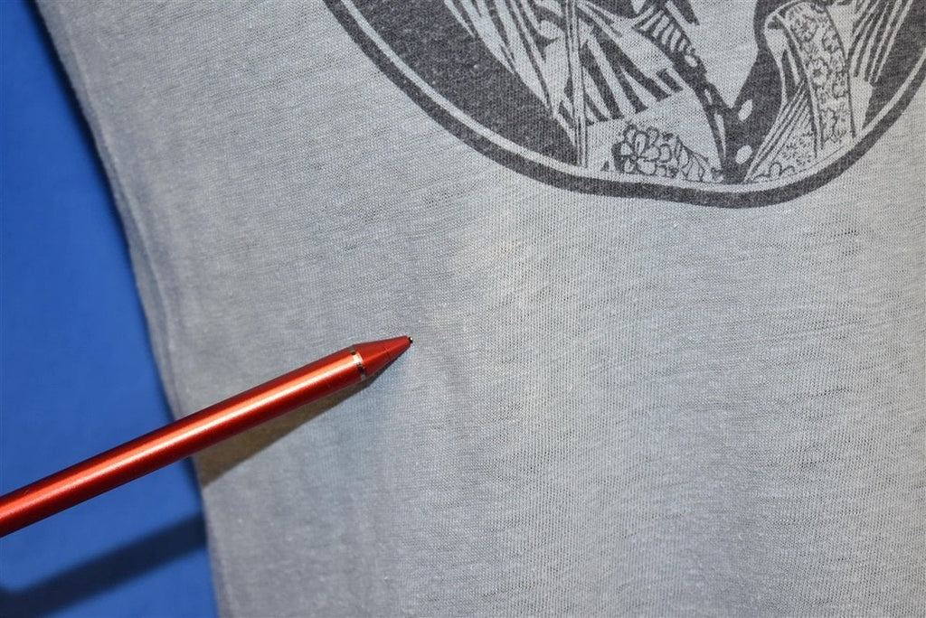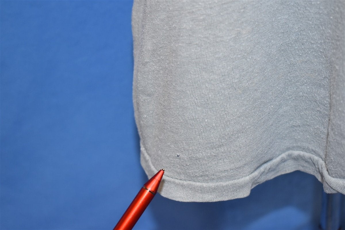Fits like a modern unisex adult small. This shirt is faded with small spots and holes, see pics.