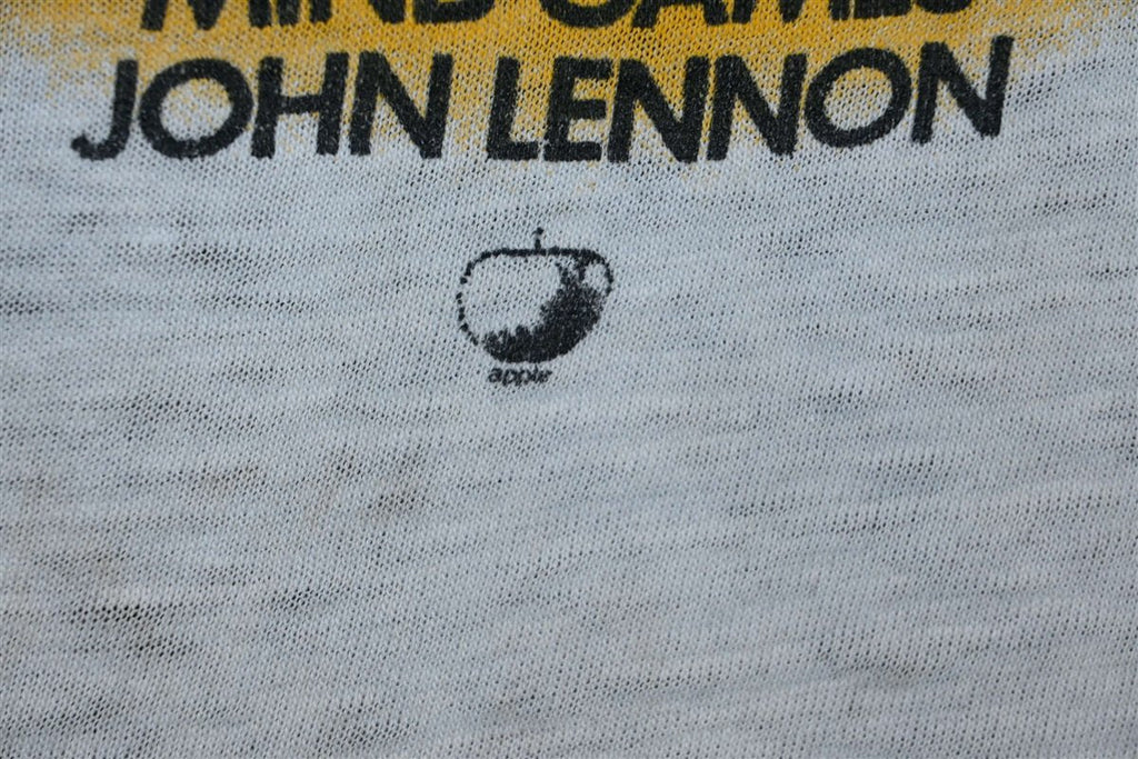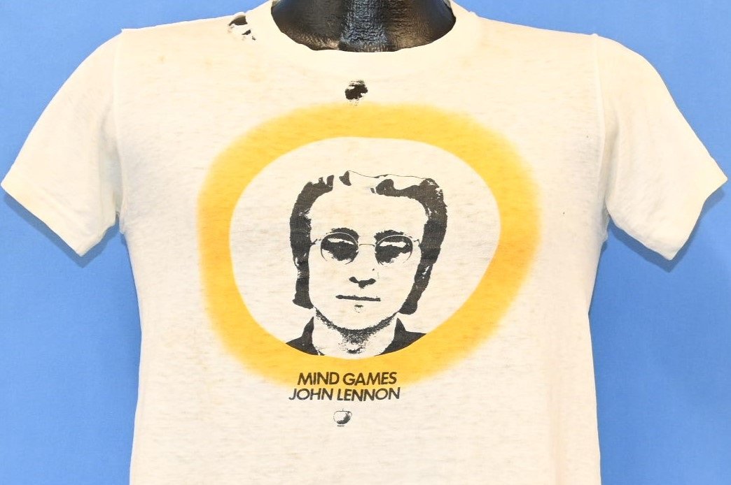 This amazing tee is a piece of 70s rock memorabilia that celebrates former Beatles member, John Lennon. This shirt was made after the group broke up, while Lennon was establishing his own legacy as a solo artist, and the tee promotes his 1973 album, Mind Games. This album was recorded and released during what Lennon referred to as his, "lost weekend", which was how he described his 18 month-long separation from his wife and frequent collaborator, Yoko Ono. This was also Lennon's first self-produced album, which was created without any assistance from Phil Spector.