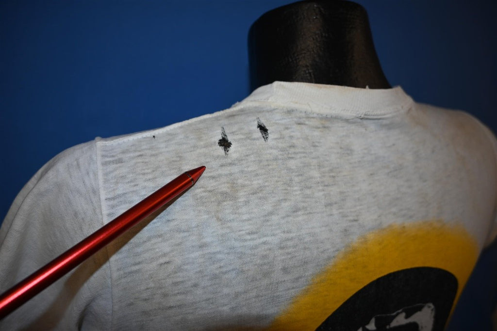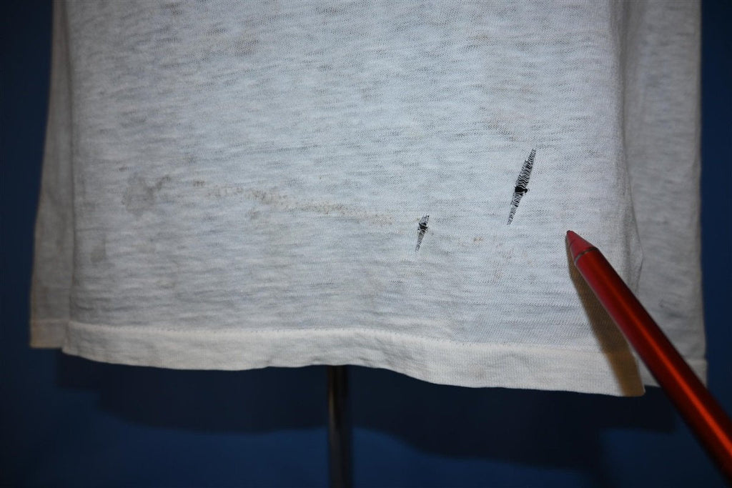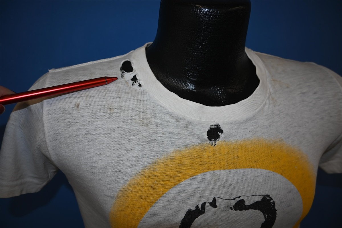 Fits like a modern unisex adult small. This shirt is soft and distressed with several holes, see pics.