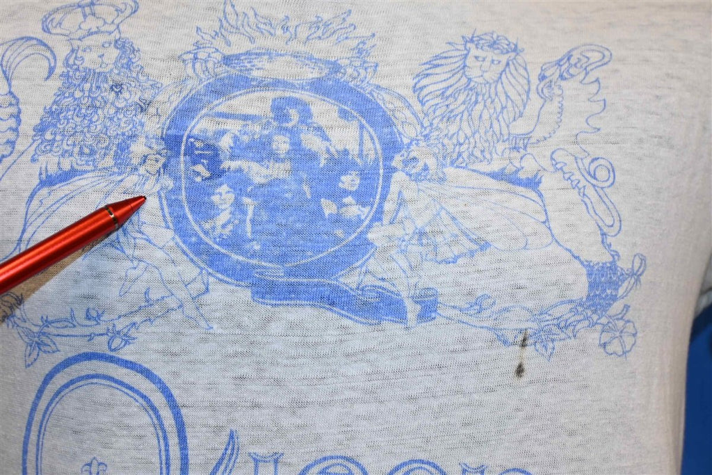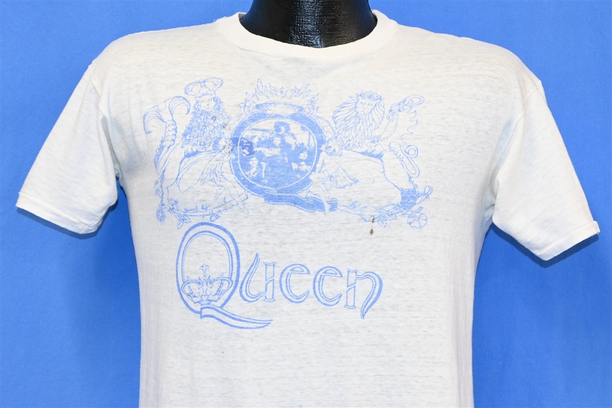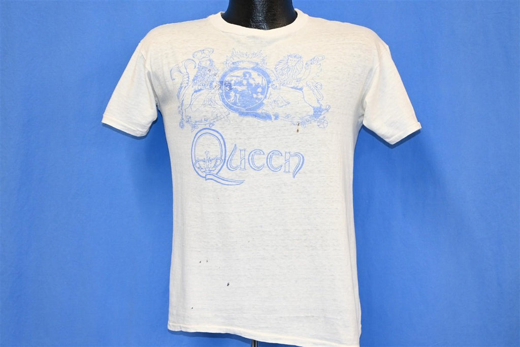 This incredible t-shirt is a remarkable piece of rock 'n roll memorabilia. It dates back to the early 1970s and is one of the earliest t-shirts made for the legendary British band. The logo on this tee is the earliest edition of the band's logo, called the Queen crest. The design is notably missing the phoenix that normally looms over the crest. This shirt was most likely printed in anticipation of Queen's first US tour in 1974, shortly before the band was big enough to have their own official merch.