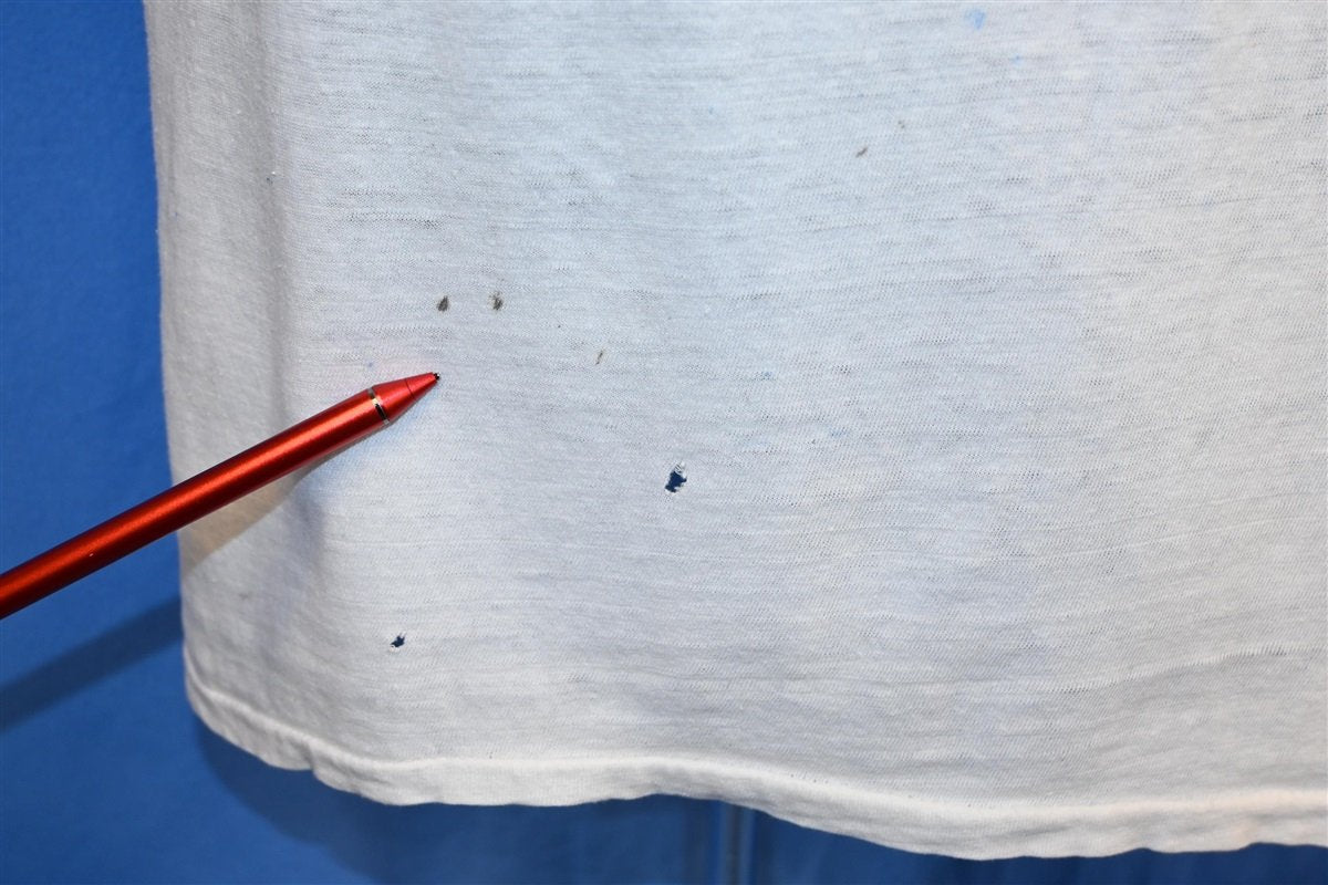Fits like a modern unisex adult small. This shirt is soft, thin, and distressed with several spots and holes throughout, see pics.