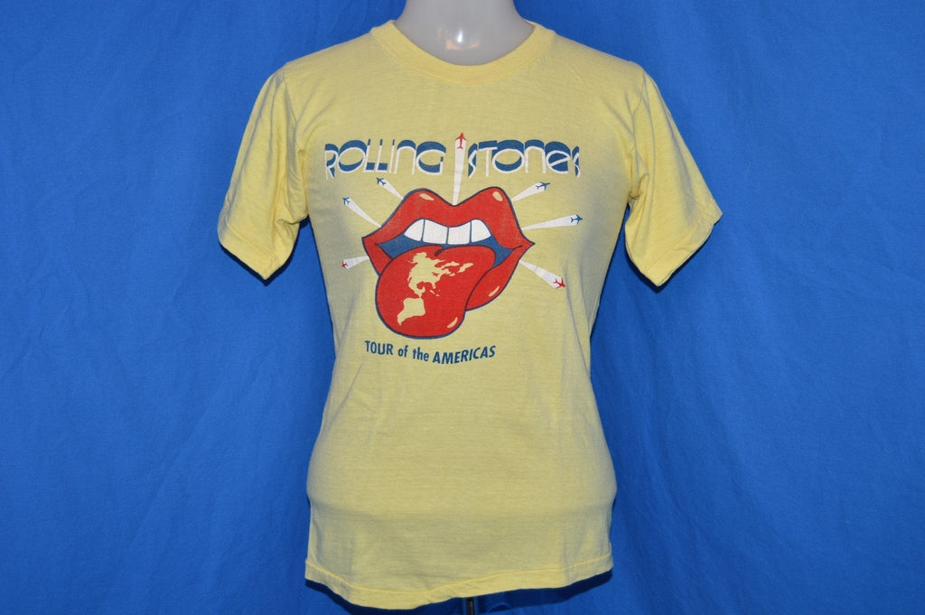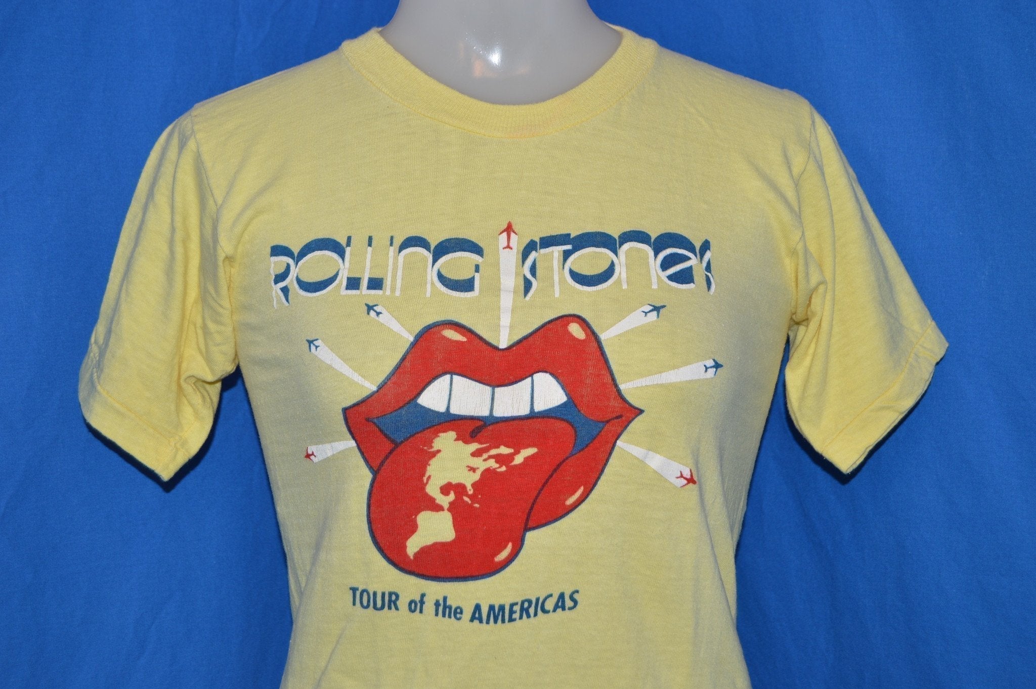 This Rolling Stones t-shirt is from the iconic English rock band's Tour of The Americas in 1975. The tour was not originally intended to support any specific album release. By the time the Rolling Stones started their tour of North America, it had been seven months since they released their last recorded album It's Only Rock 'n Roll. In order to capitalize more on the tour, they released a compilation album entitled Made in the Shade. When the band announced the tour on May 1st, 1975 the group scheduled a press conference and then ditched the event. Rather than appearing in front of the press, the Stones rolled up on a flatbed truck outside the venue and performed a concert for the lucky fans who were attempting to catch a glimpse of the band. The band performed an extended version of "Brown Sugar" and drove off.