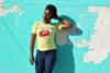The shirt features a multi-colored graphic the Stones' iconic "Tongue and Lip Design" logo with a map of the Americas on the tongue and small graphics of airplanes.