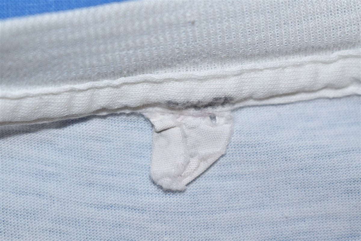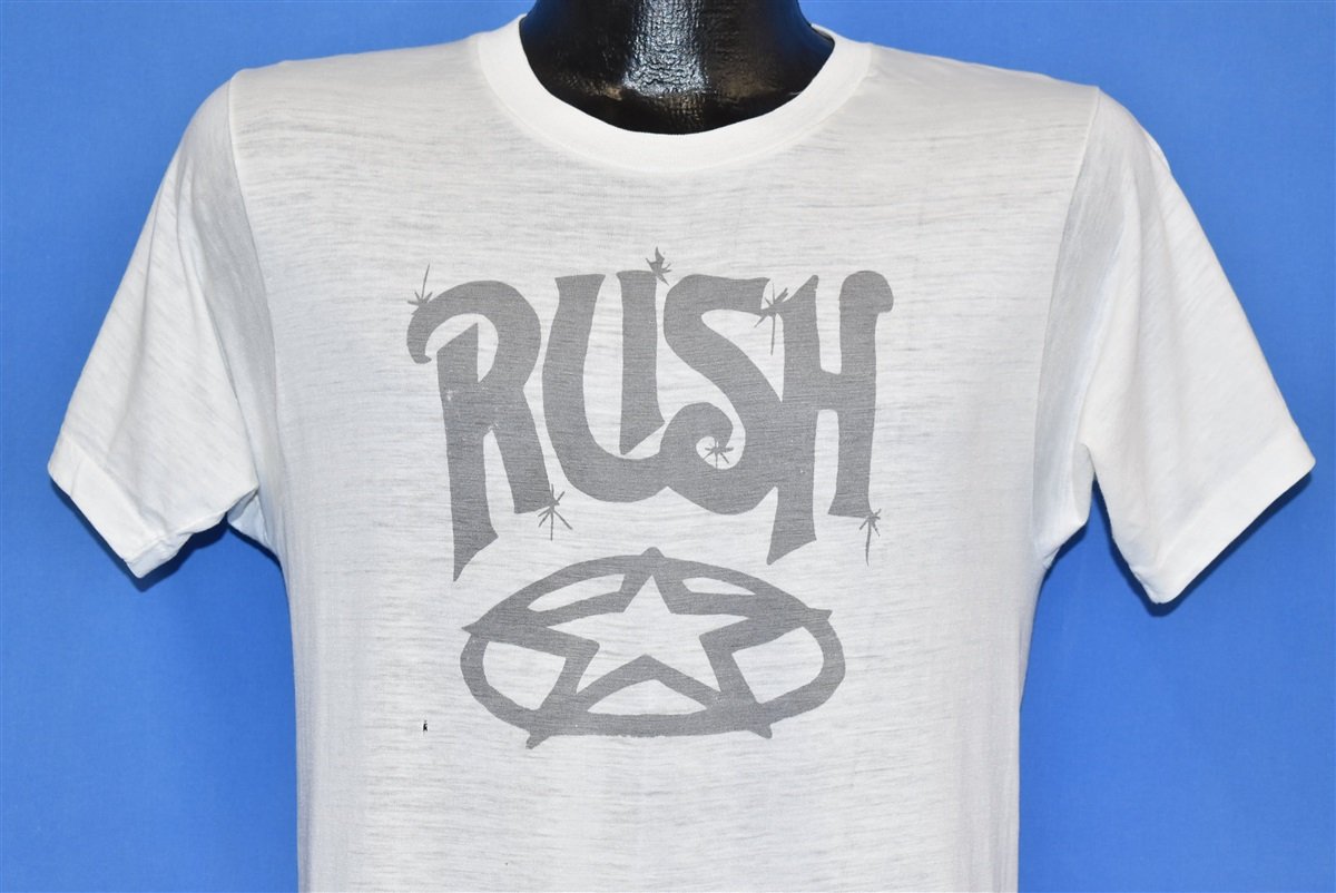 This vintage tee pays tribute to the rock band Rush circa 1970s. It's seen a lot of loving over the years, rendering the cotton blend super thin and buttery soft. Features an old school Rush star logo, maybe from a concert or tour during the era.
