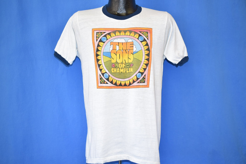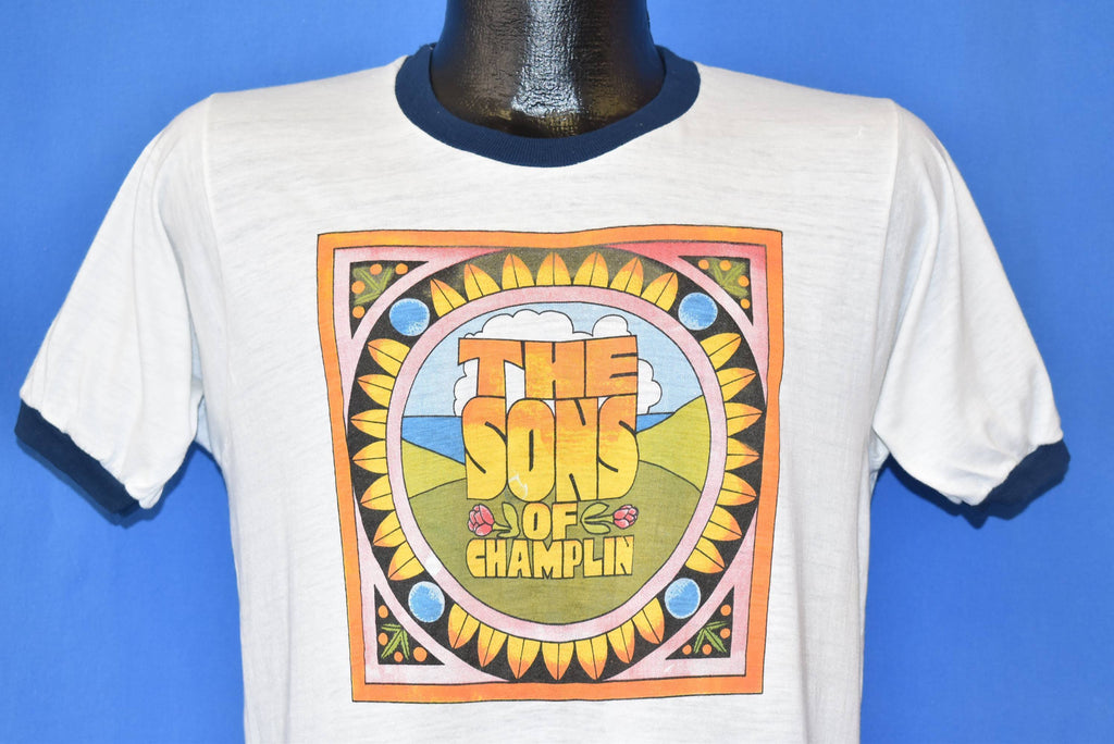 This cool vintage band tee is for the Sons of Champlin and features the artwork for the cover of their 1975 self-titled album. This was the band's sixth studio album, and it was originally recorded in their own studio and released on the their own record label. The album was later purchased and re-released by Ariola America. Songs on the album included "I'd Like to Get To Know You", "Without Love", "Rainbow's End", "Queen of the Rain", and "Goldmine".