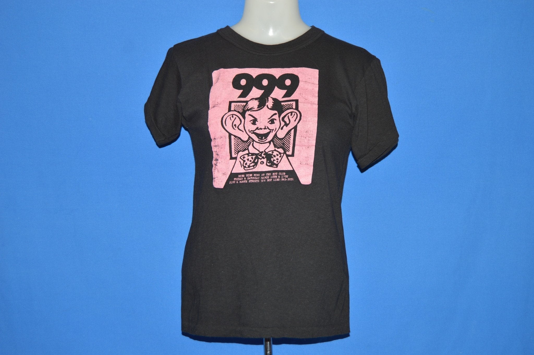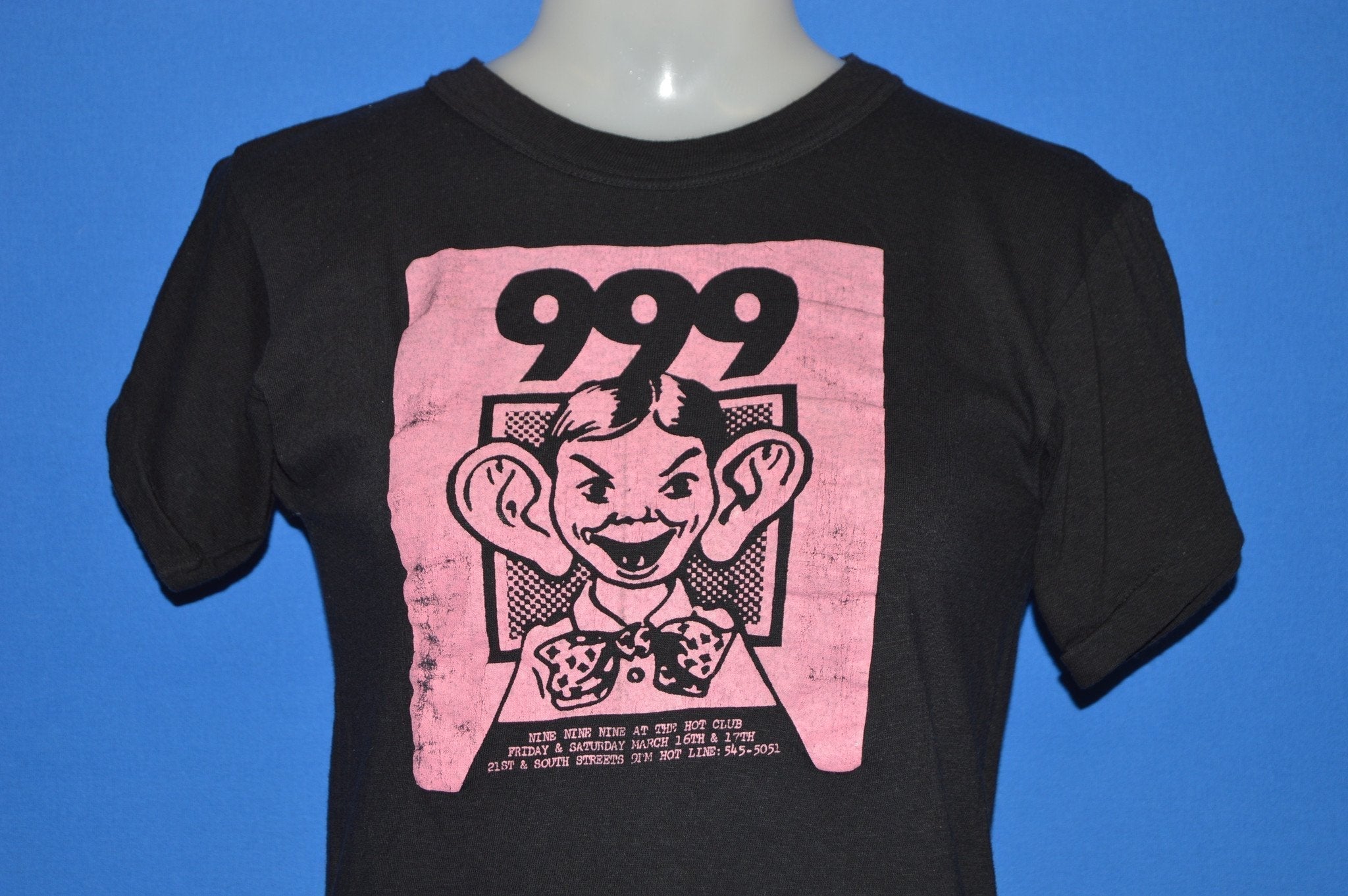 This amazing vintage punk rock shirt is from a performance by the English punk band Nine Nine Nine in Philadelphia, PA. Their appearance was a back-to-back Friday-Saturday show which took place in March of 1984 at the legendary punk scene venue the Hot Club located on 21st and South Street. The 999 lineup included Nick Cash on vocals and guitar, Guy Days on lead guitar, Jon Watson on bass guitar and Pablo LaBrittain on drums. The band had just released their album 13th Floor Madness in November of 1983, and Concrete in April of 1981, both under the Albion Label. It's very likely that this performance included the singles "13th Floor Madness", "Nightshift" and "Arabesque" off of 13th Floor Madness. We were contacted by the artist of the flyer who told us he made this design in 1979.