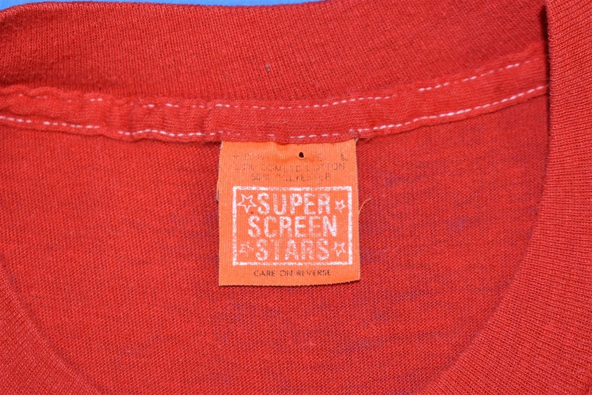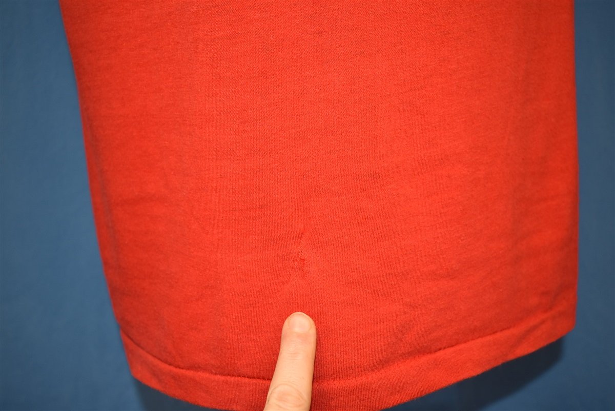 The tag says large but this shirt fits like a modern unisex adult medium. There is a repair on the back near the bottom, see pics.