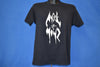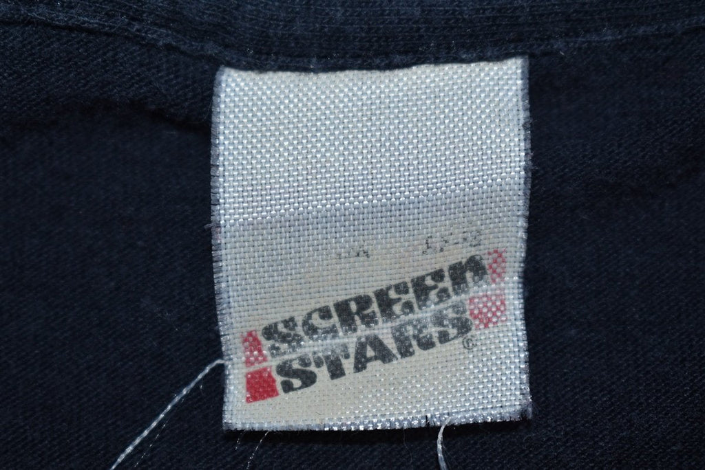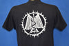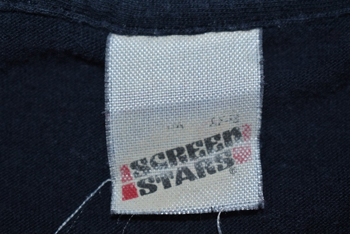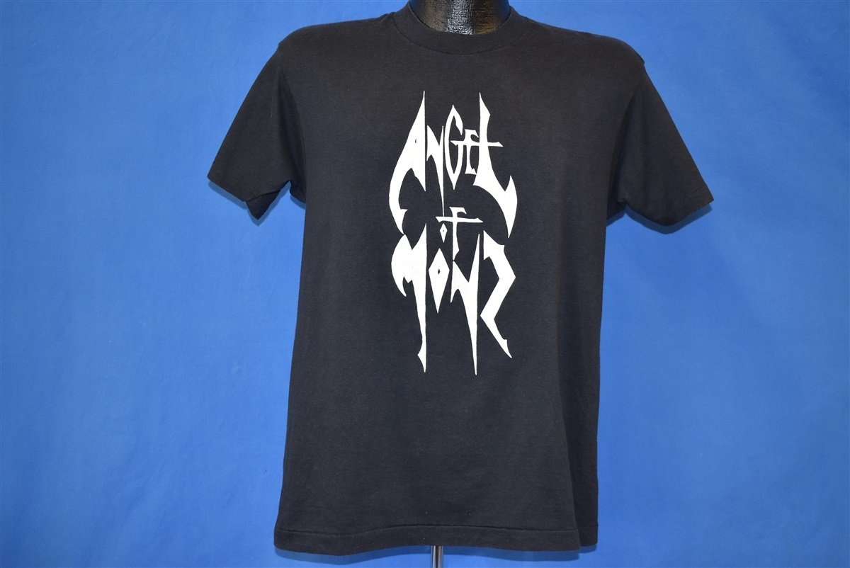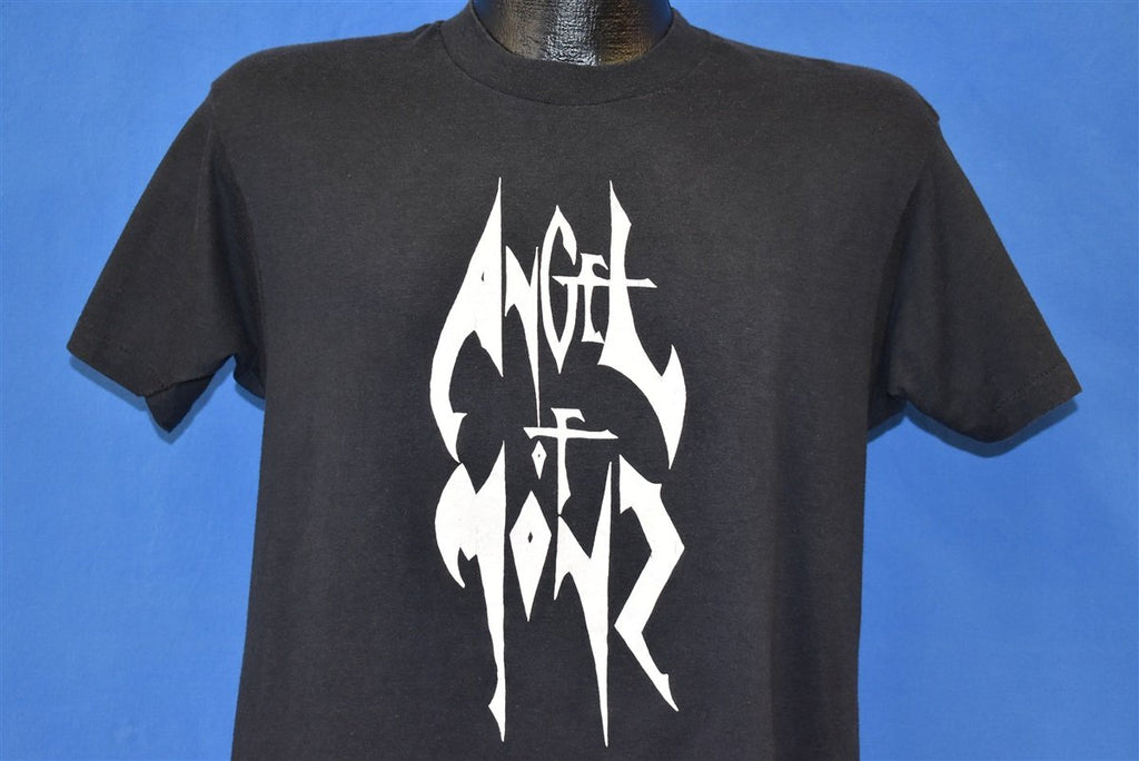 This black shirt is from the 80s and features the text "Angel of Monz" on the front with a logo on the back. Clocks (Angel of Monz) is the name of an album by Steve Hackett. Hackett is an English musician, songwriter, singer, and producer who rose to fame as the guitarist of the progressive rock band Genesis from 1971 to 1977. The Angels of Mons is also a popular legend about a group of angels who supposedly protected members of the British Army in the Battle of Mons at the outset of World War II.