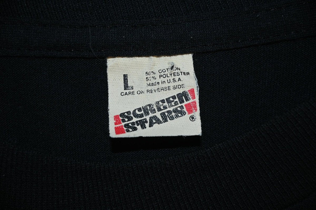This awesome shirt is a rare gem from a defunct heavy metal band called Blitzspeer. The group emerged out of the New York City scene in 1988, and they released only a single full-length studio album before disbanding. This shirt features the same sweet skull logo that was used for the cover of their debut release from Epic Records, a live album simply titled Blitzspeer Live. The album was recorded during a show at the famous Limelight nightclub in Manhattan, back when it was still considered to be more of a rock club. Although the design doesn't sport the artist's usual signature, the cover for Blitzspeer Live was drawn by the infamous Pushead, a graphic artist best known for his work with Metallica.