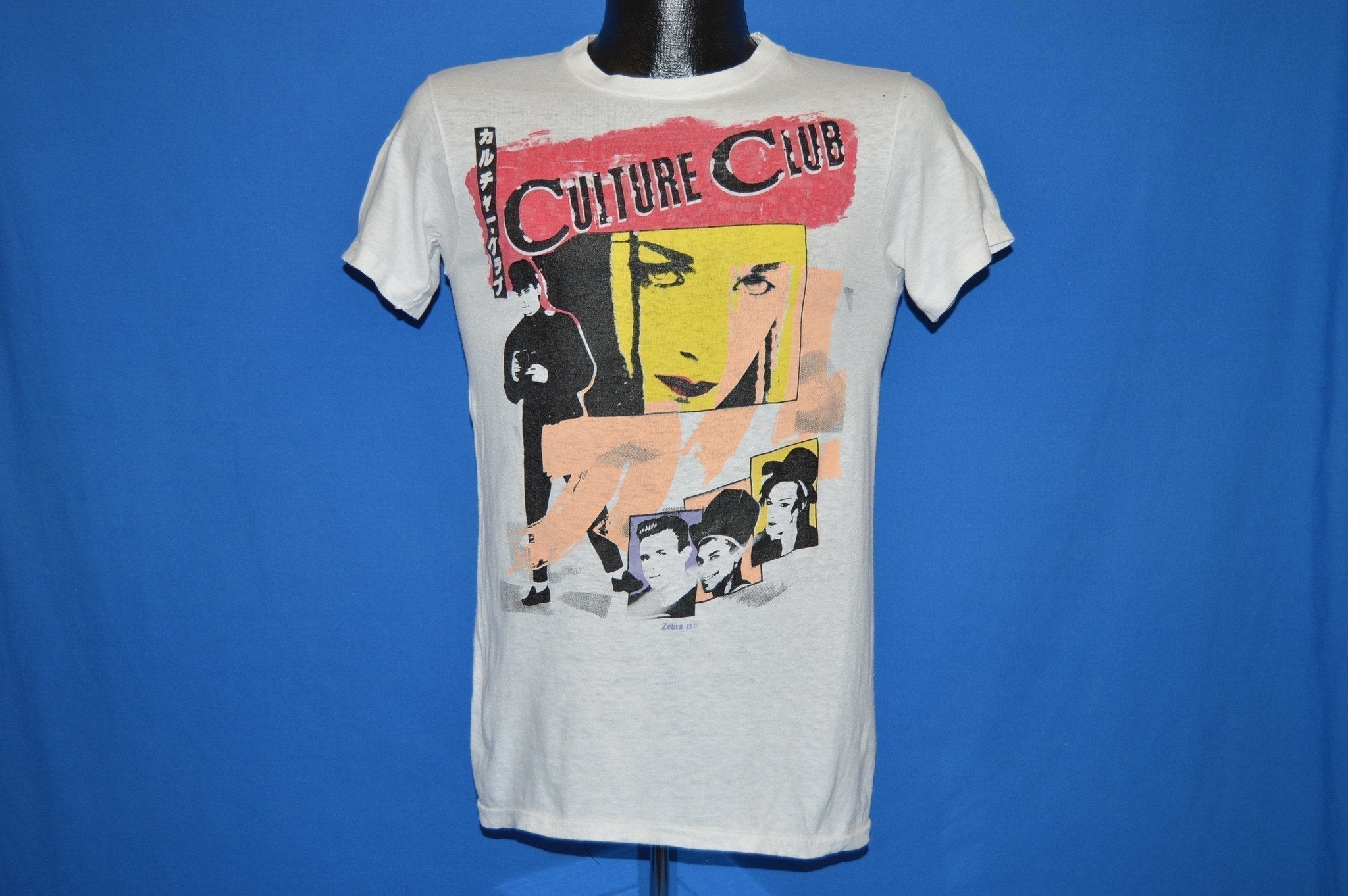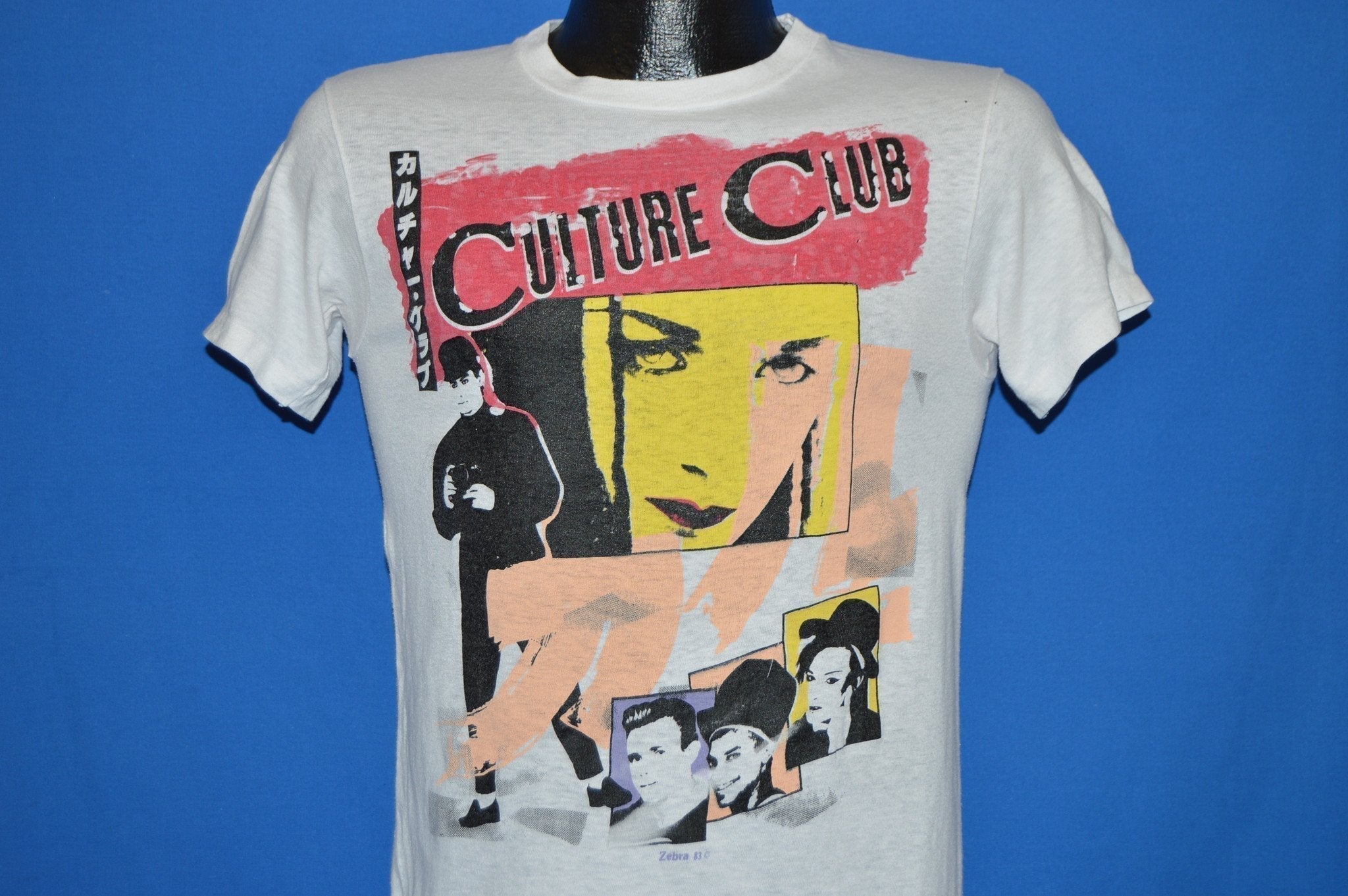 This sweet band t-shirt is for Culture Club and highlights their hit single "Church of the Poison Mind". The single originally appeared on the new wave band's second studio album, Colour By Numbers. Colour By Numbers was Boy George and the Culture Club's most successful album reaching the number one spot in the UK, and selling 16 million copies in all countries. "Church of the Poison Mind" never quite reached the top single position, only because David Bowie's "Let's Dance" held on to its formidable position at the top of the charts. The success of the single caused Epic Records to release "Karma Chameleon" ahead of schedule to in order catch Culture Club's rising tide in the charts.