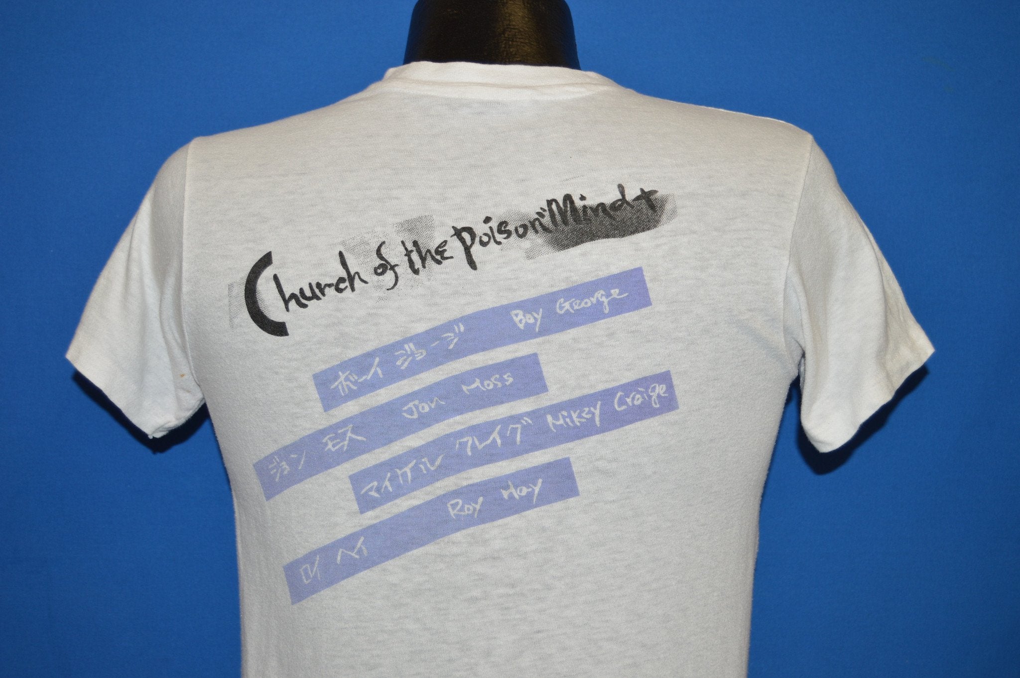 The front of the t-shirt has a hand painted-like design of Boy George and the other members of the band. The back says "Church of the Poison Mind" and lists the members Boy George, Jon Moss, Mikey Craige and Roy Hay spelled in their Japanese katakana forms.