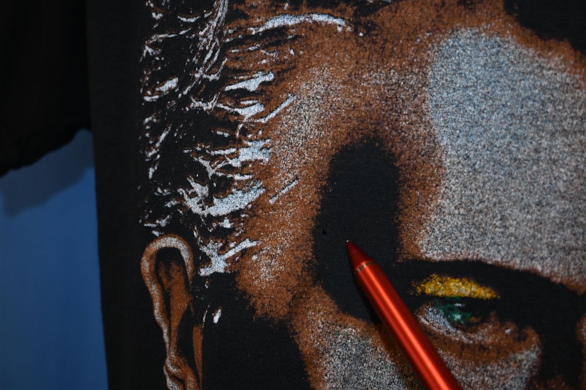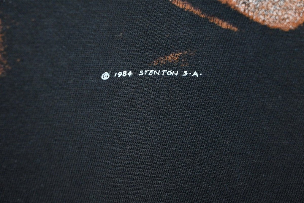 This incredible vintage tee showcases a portrait of the iconic English musician David Bowie. This shirt is copyright to Stenton S.A. from 1984. This publishing company worked with Bowie in the 80s and 90s and managed his copyrights during his Serious Moonlight Tour in the mid 80s. This tour was launched in 1983, to promote the singer's latest album Let's Dance. At the time, The Serious Moonlight Tour was Bowie's longest, largest, and most commercially successful concert tour to date.