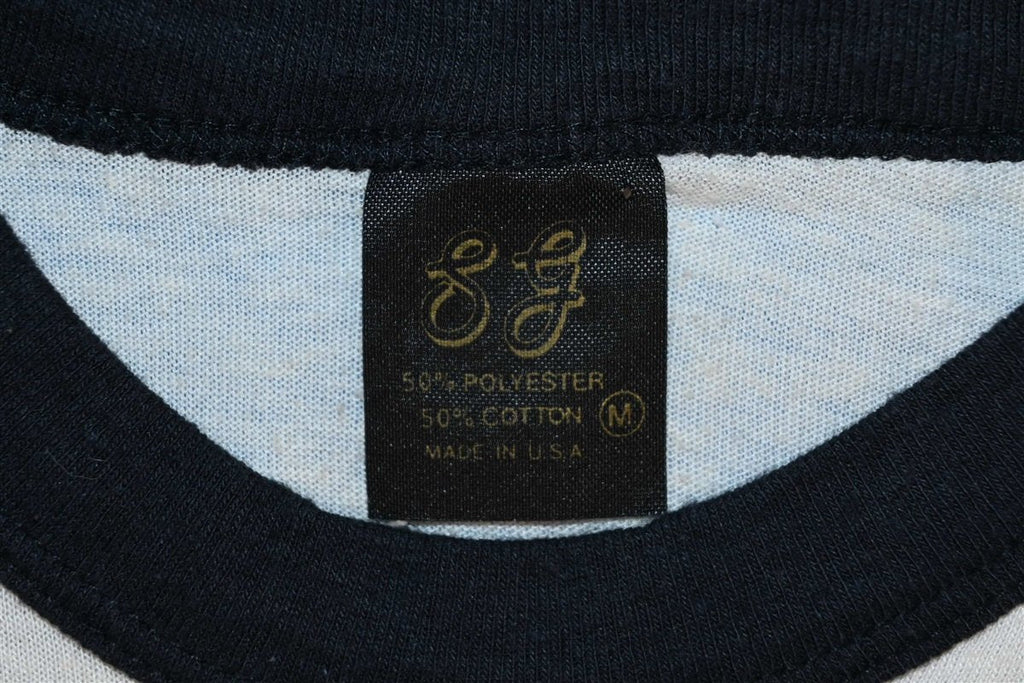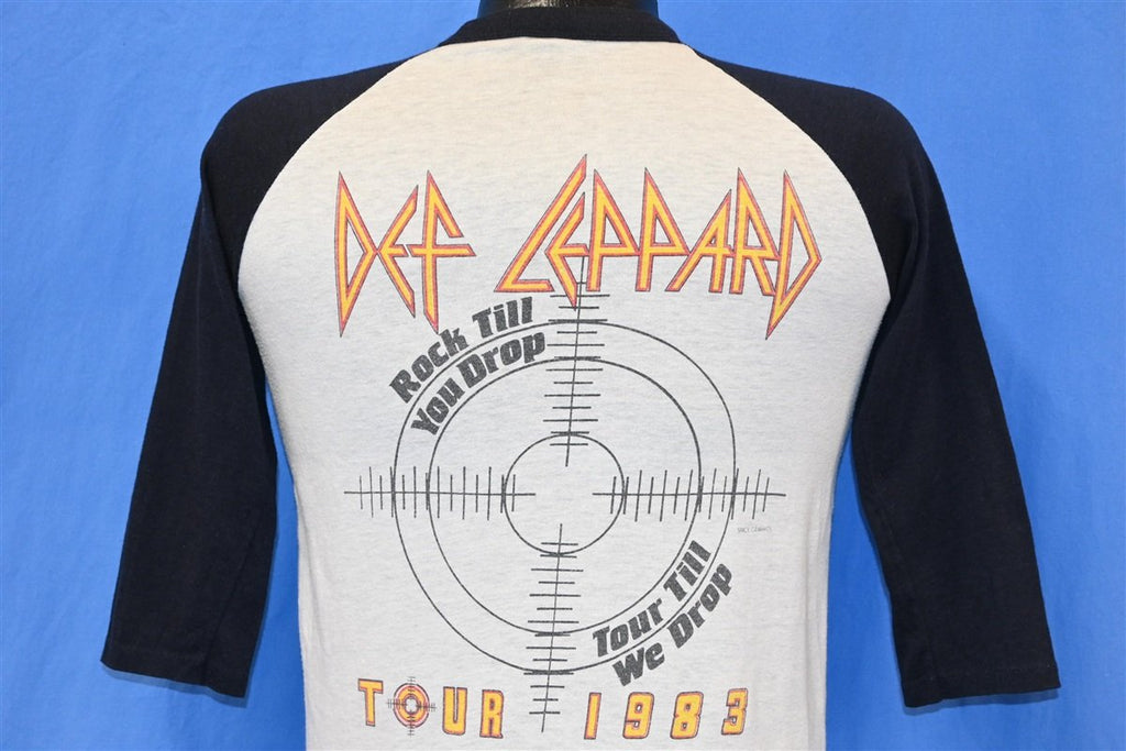 This cool double-sided concert tee is for the English rock band Def Leppard. The shirt is from their 1983 tour promoting their third studio album Pyromania and the front features the same image as the album cover while the back reads "Rock Till You Drop Tour Till We Drop" in reference to the song "Rock! Rock! (Till You Drop)". The music video for the song was actually shot during the Pyromania Tour at a show in Japan in January of 1984.
