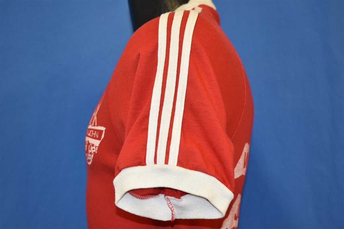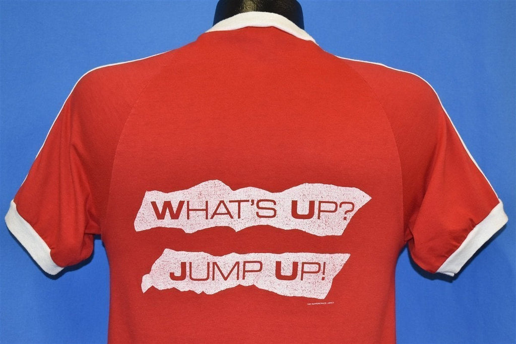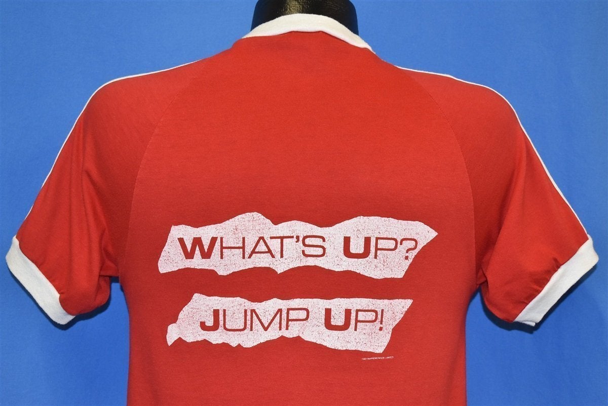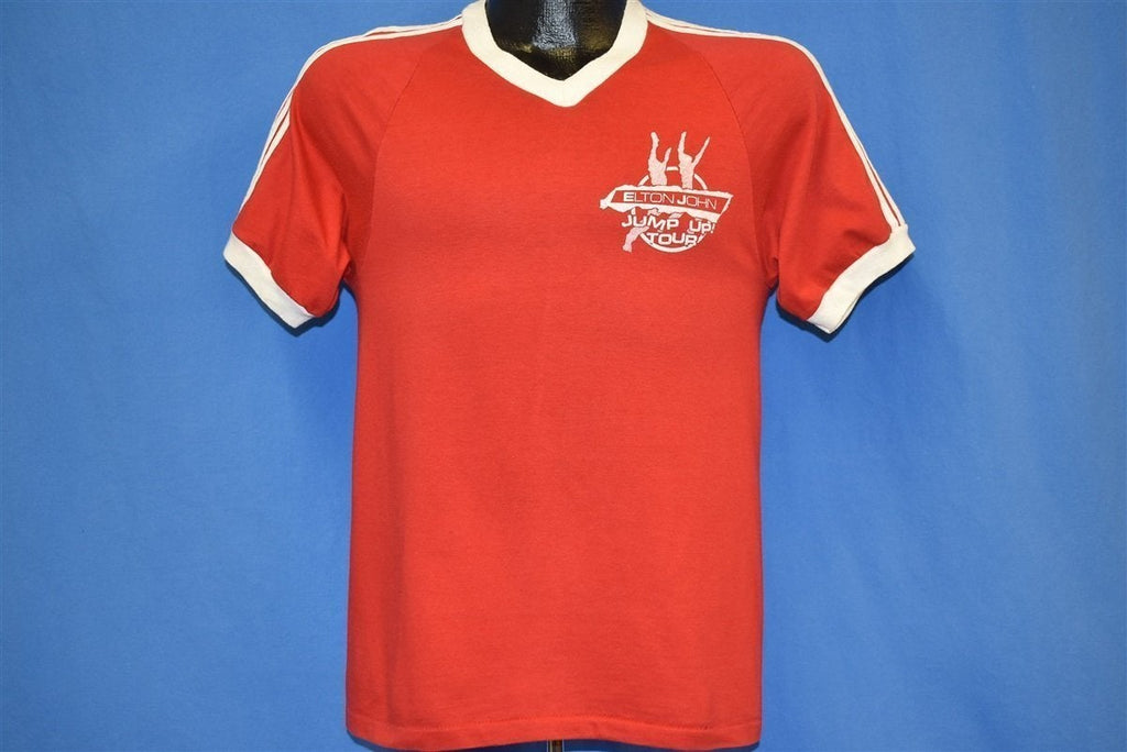 This classic concert tee pays tribute to Elton John's Jump Up Tour circa 1982. It's held up beautifully and perfectly captures that old school rocker vibe. Features a cool jersey style, ringer sleeves, and v-neck collar.