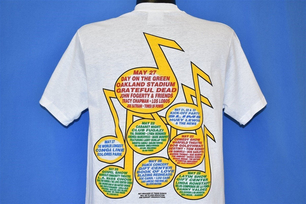 This vintage concert shirt is from the 1989 concert benefit for AIDS relief titled In Concert Against AIDS. The benefit included a number of concerts and events spread out over the course of several days and at different venues. This included a comedy show at the Warfield Theatre featuring Bobcat Goldwait and Tom Kenny, a kick off party with Huey Lewis and the News, a cabaret night at Club Fugazi, a dance concert, a Latin show headlined by Linda Ronstadt, a gospel show featuring the LA Mass Choir, and the world's longest conga line. The main event of the benefit took place on Saturday May 27 and it was a nine and a half hour marathon rock concert headlined by the Grateful Dead at Oakland Stadium. Other featured performers for the concert were John Fogerty of Creedance Clearwater Revival, Tracy Chapman, Los Lobos, Joe Satriani, and Tower of Power.