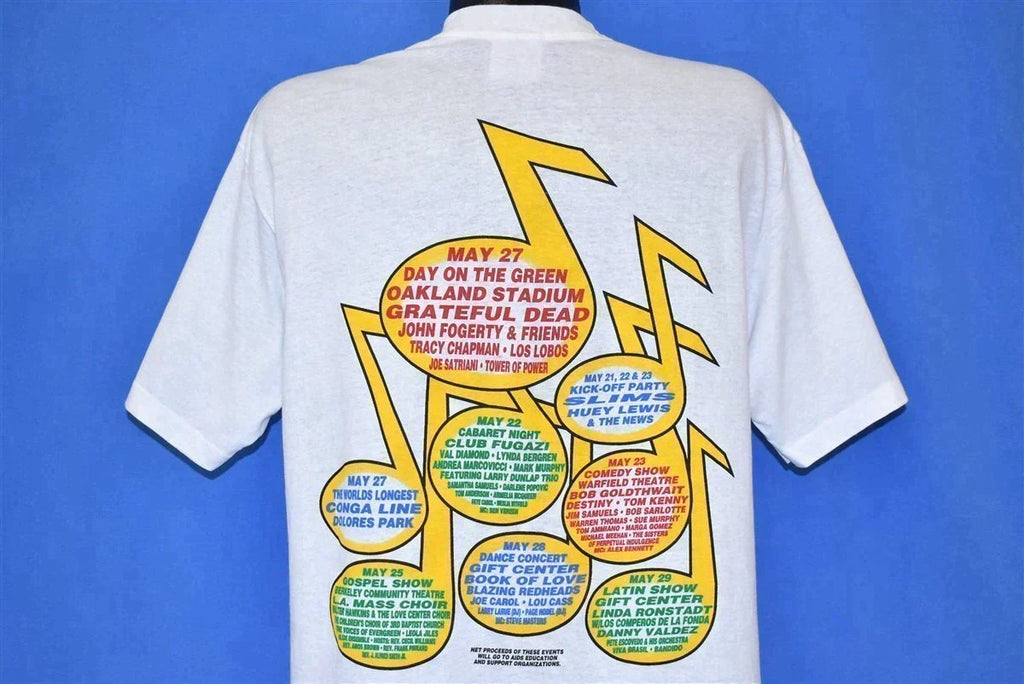 This vintage concert shirt is from the 1989 concert benefit for AIDS relief titled In Concert Against AIDS. The benefit included a number of concerts and events spread out over the course of several days and at different venues. This included a comedy show at the Warfield Theatre featuring Bobcat Goldwait and Tom Kenny, a kick off party with Huey Lewis and the News, a cabaret night at Club Fugazi, a dance concert, a Latin show headlined by Linda Ronstadt, a gospel show featuring the LA Mass Choir, and the world's longest conga line. The main event of the benefit took place on Saturday May 27 and it was a nine and a half hour marathon rock concert headlined by the Grateful Dead at Oakland Stadium. Other featured performers for the concert were John Fogerty of Creedance Clearwater Revival, Tracy Chapman, Los Lobos, Joe Satriani, and Tower of Power.