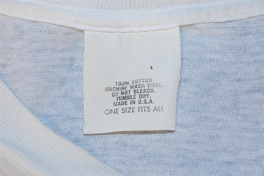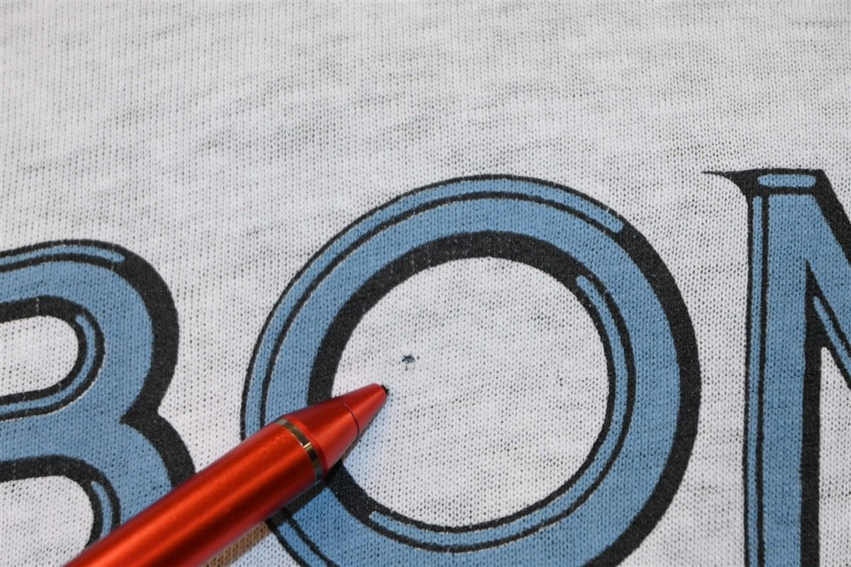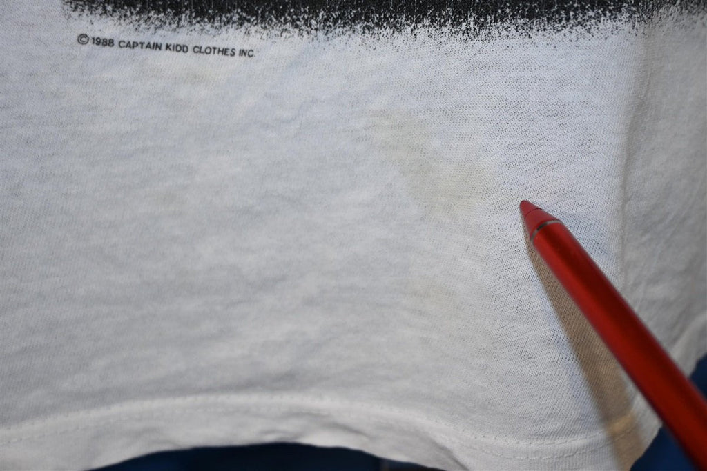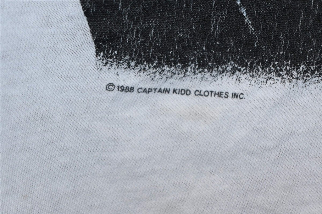 This sweet shirt features a big print graphic of Jon Bon Jovi, the eponymous front man of Bon Jovi. This shirt was made in 1988 to celebrate the launch of Bon Jovi's New Jersey Syndicate Tour. This two-year long world tour was designed to promote the band's fourth studio album, New Jersey, which was the follow up to what was arguably the band's breakthrough hit, Slippery When Wet. Like its predecessor, New Jersey reached the top of the Billboard 200, and it also produced several hit singles, which included "Bad Medicine", "Born to Be My Baby", "I'll Be There for You", "Lay Your Hands on Me", and "Living in Sin".