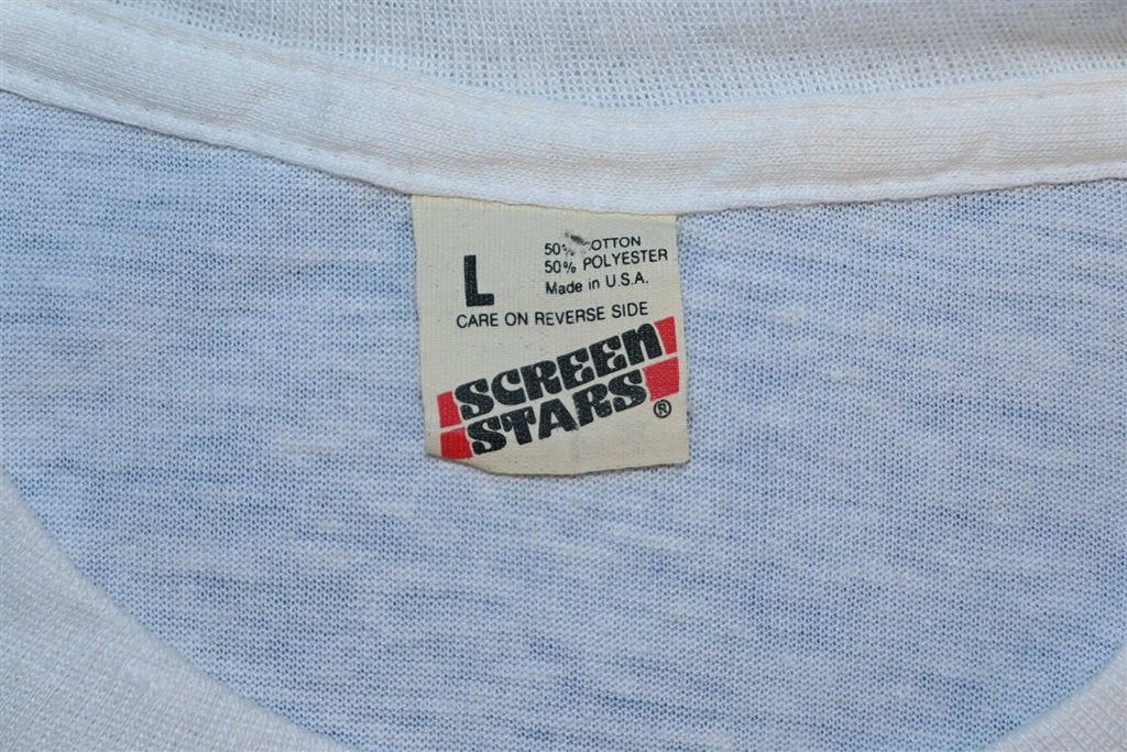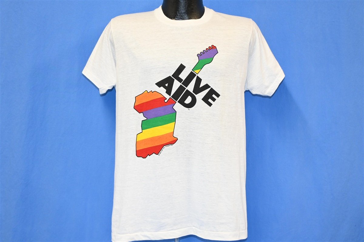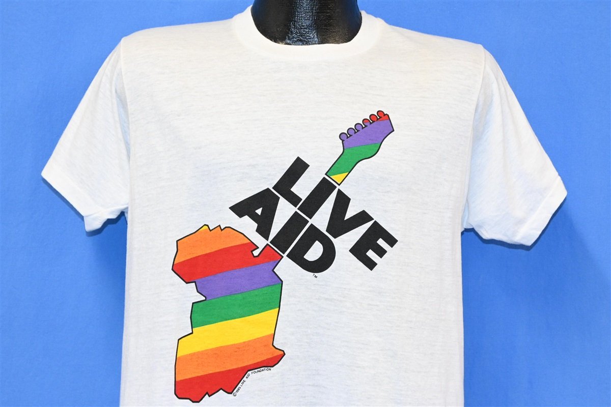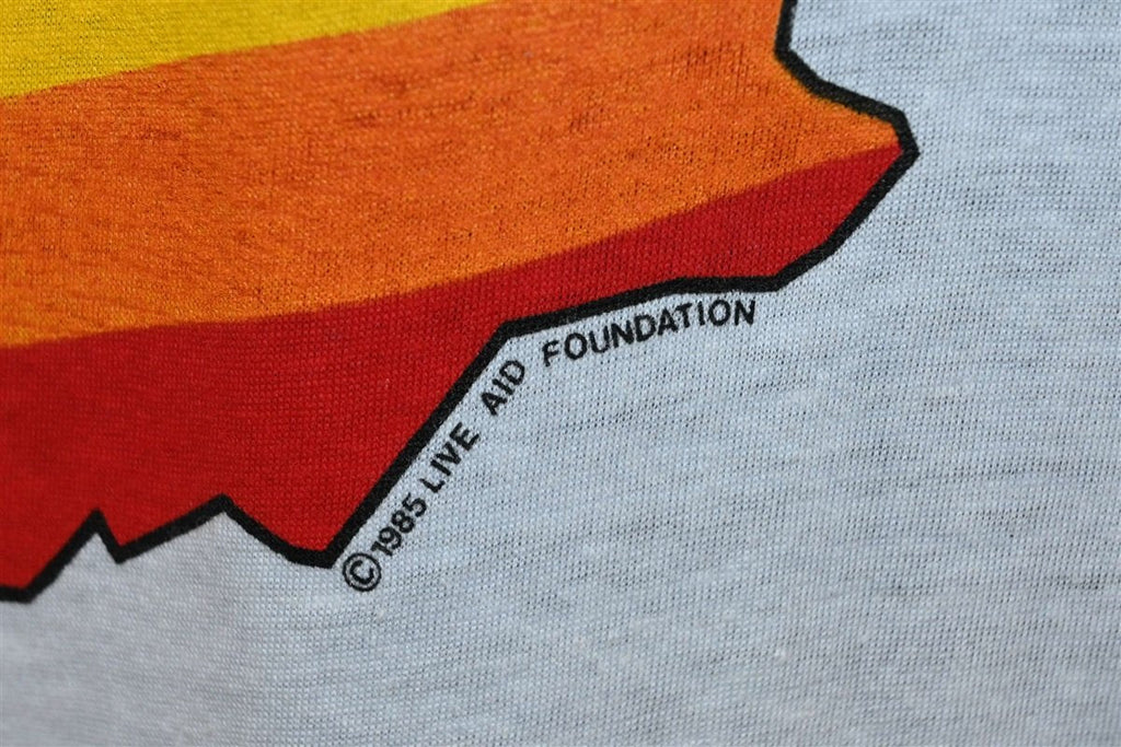 This amazing graphic tee is a souvenir from the multi-venue benefit concert Live Aid. The concert was held simultaneously in London, UK and Philadelphia, PA on July 13 1985. This benefit concert for famine relief in Ethiopia, saw over 100,000+ people attend both venues and nearly 40% of the world's population tune into the live broadcast of the shows.