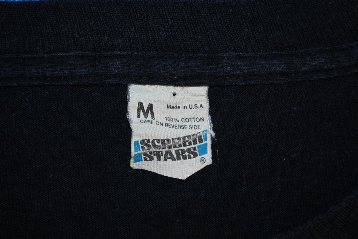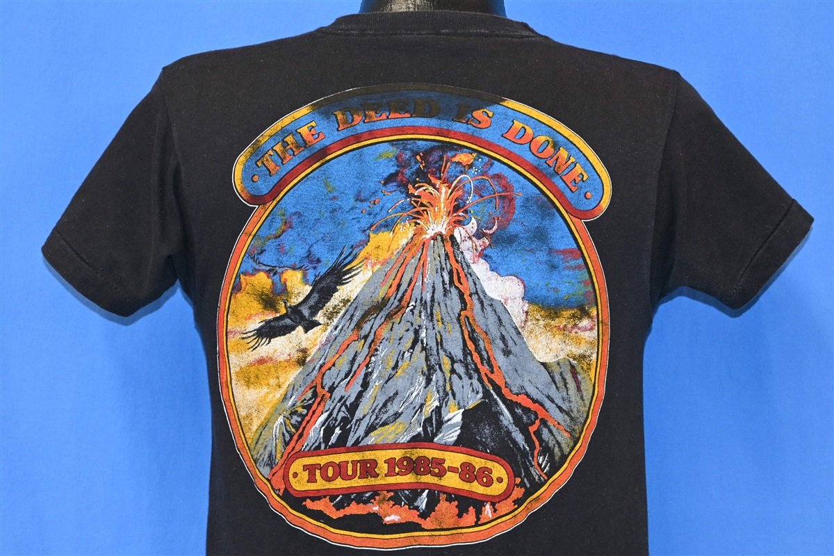 This awesome double-sided concert tee is for the southern rock band Molly Hatchet and the shirt is a souvenir from the 1985-1986 concert tour that promoted their album The Deed is Done. The shirt features some awesome fantasy graphic that were showcased on the packaging for the album. These intense high fantasy illustrations were typical for the band, but unlike many of their famous album covers which were often designed by Frank Frazetta, this one was painted by the artist Ezra Tucker.