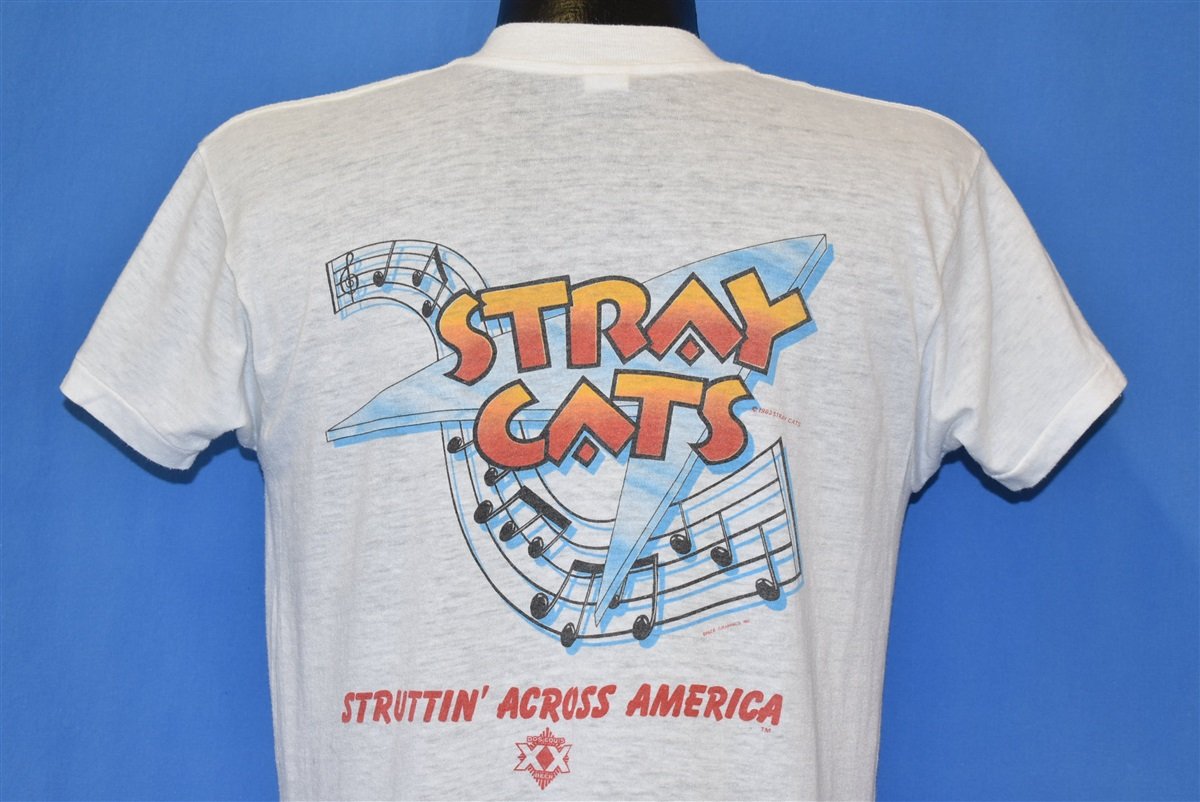This shirt is from 1983 when the band put out their album Rant n' Rave with the Stray Cats. The album included a few hit tracks, such as "(She's) Sexy + 17", "I Won't Stand in Your Way", and "Look at That Cadillac". The group broke up shortly after this, with Setzer pursuing a solo career, while Rocker and Phantom formed a new trio called Phantom, Rocker, & Slick and featured former David Bowie guitarist Earl Slick.