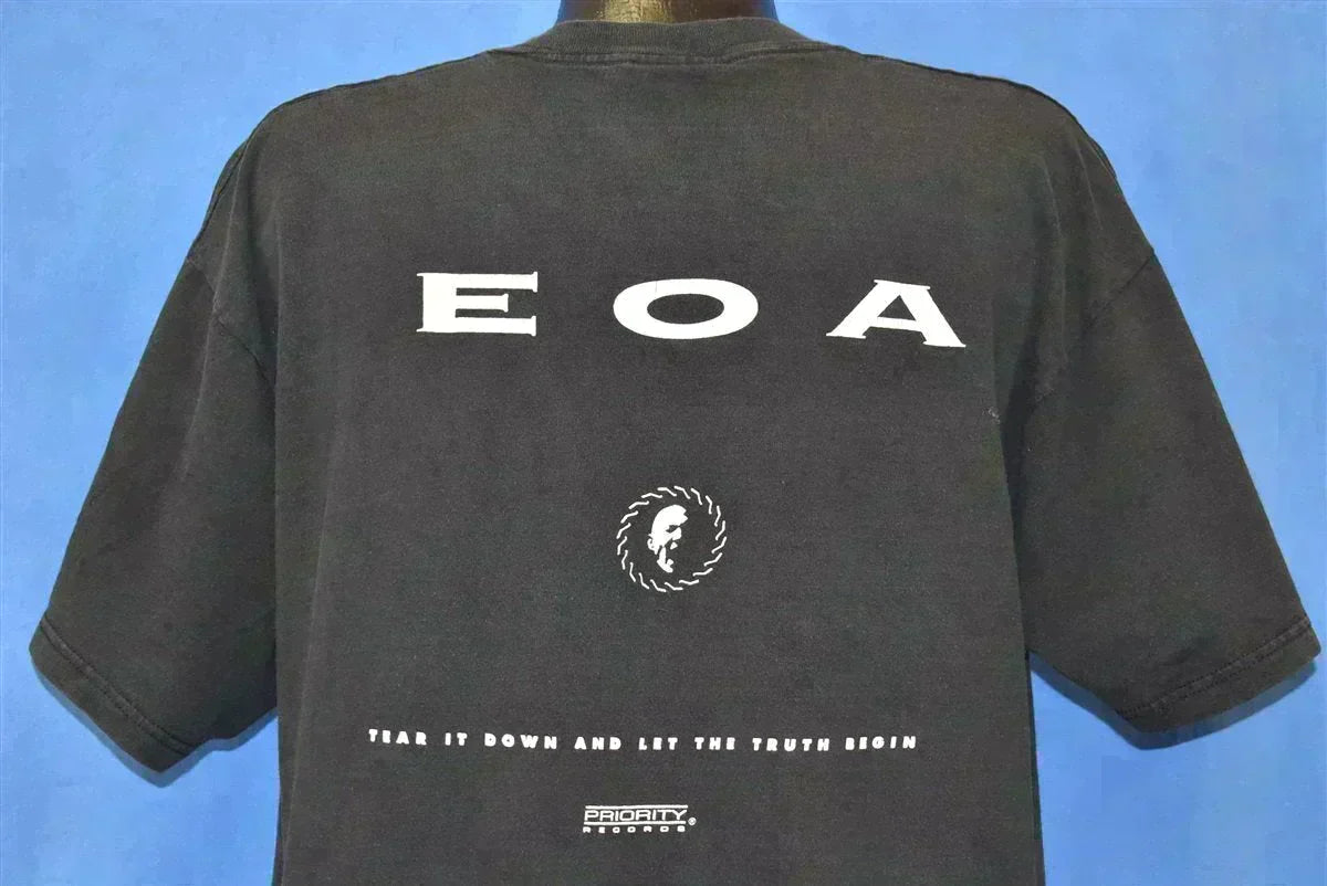 This vintage double-sided t-shirt is for the Los Angeles based industrial rock band Engines of Aggression. The shirt is for the band's 1993 EP Speak which was released by Priority Records. The EP was made the same year that the band formed and it was followed a year later by the group's debut album entitled Inhuman Nature. This was the only full-length album to be released by the band, although they did come out with a second self-titled EP in 2001. Rik Schaffer served as the band's guitarist. He was also a member of the band Tommorow's Child and is known for his work on the soundtrack to the video game Vampire: The Masquerade-Bloodlines.