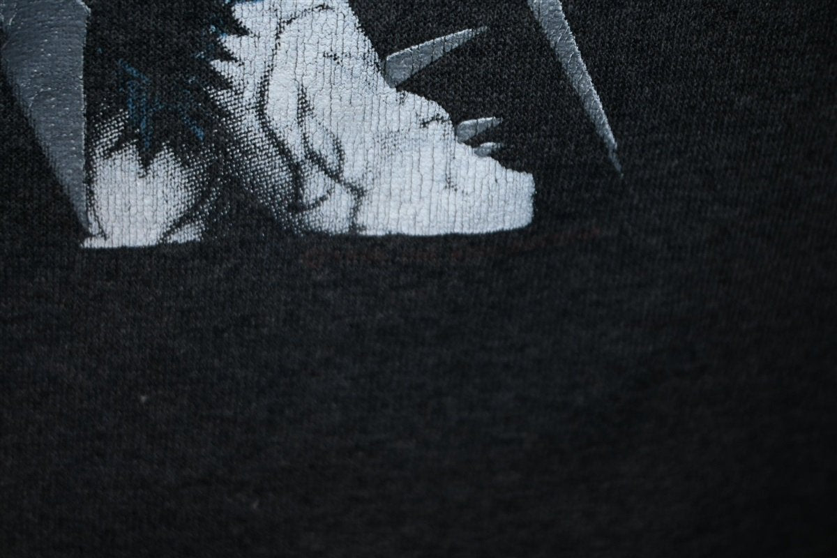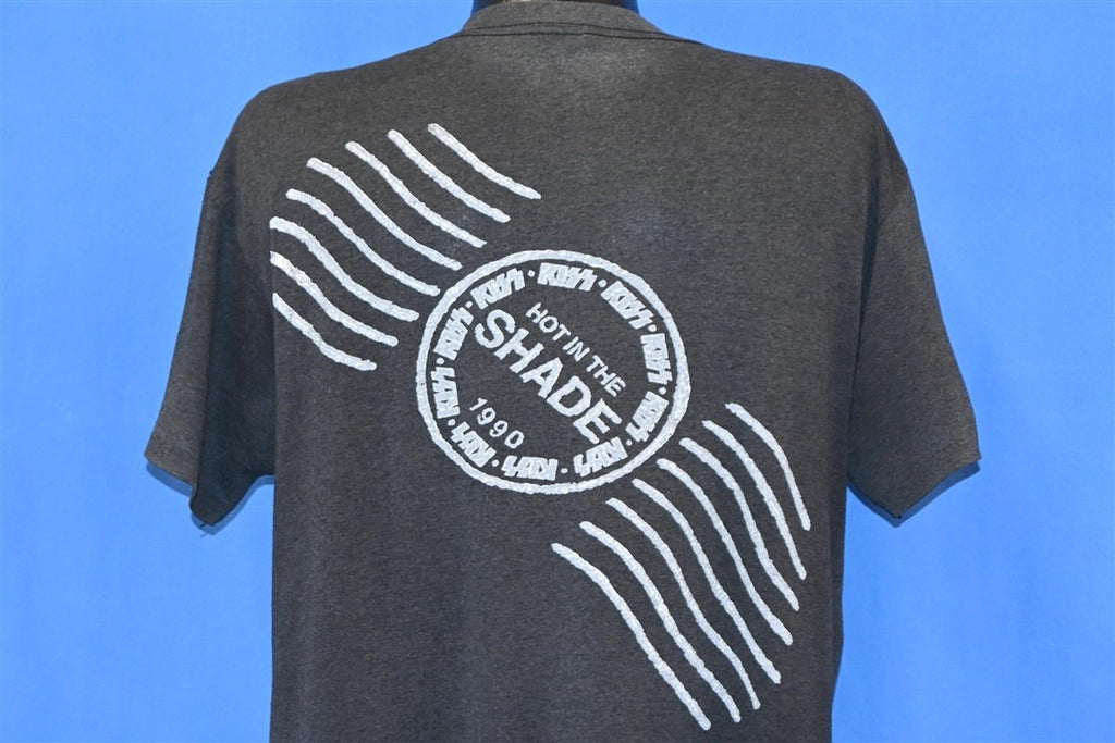 This awesome distressed tee is from the band Kiss's 1990 Hot in the Shade Tour. This tour would sadly be the last for Eric Carr, the drummer of the band featured at the center top of the graphic. Carr tragically died of heart cancer the year following this tour.