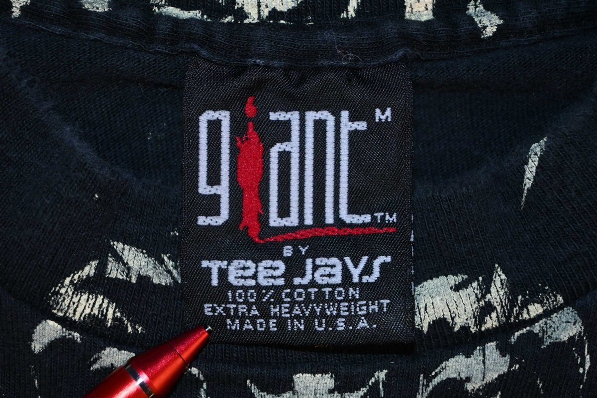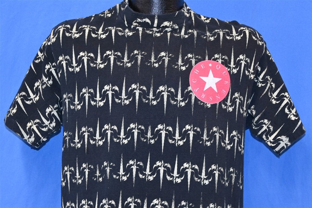 This awesome t-shirt promotes the glam metal band Queensryche, and the shirt is decked out in an all over print pattern for their fourth studio album titled Empire. Empire was released in 1990 and it's remembered as the group's most commercially successful release, having reached triple platinum status. The single "Silent Lucidity" off the record, made it to the top of the Mainstream Rock Tracks chart and earned the band Grammy Award nominations for Best Rock Song and Best Rock Vocal Performance by a Duo or Group.