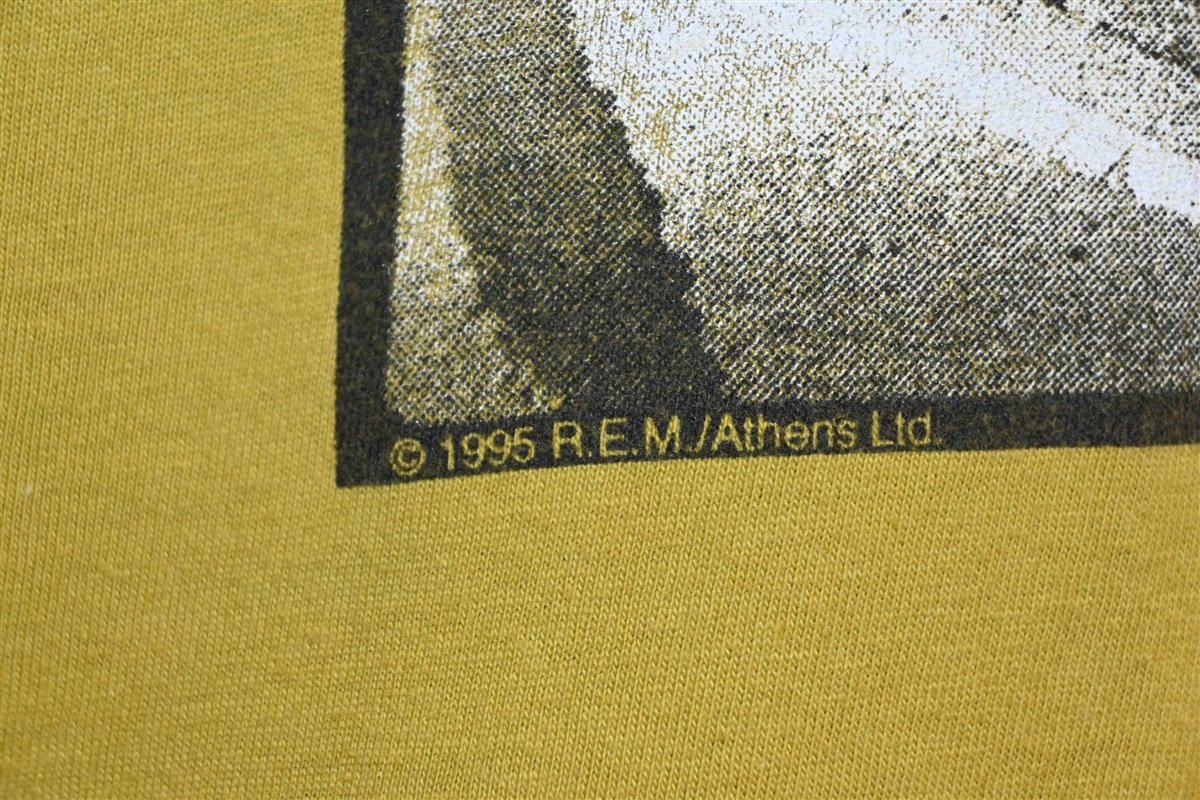 This awesome double-sided tee was made for R.E.M.'s 1995 European Tour promoting their ninth studio album Monster. This was the band's first promotional tour in six years, and it was a massive commercial success. This was even despite several health issues that plagued the band over the course of the tour. These issues forced Bill Berry, Mike Mills, and Michael Stipe to all have to undergo surgery at some point during the tour. However, the group still found time to record most of their next album, New Adventures in Hi-Fi, while on the road.