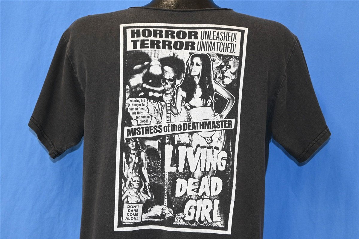 This amazing vintage tee celebrates the debut solo album from the iconic rock musician Rob Zombie. The shirt is from the late 90s and it features double-sided graphics that highlight two of the tracks off his album Hellbilly Deluxe: 13 Tales of Cadaverous Cavorting Inside the Spookshow International, "Call of the Zombie" and one of his most popular hits "Living Dead Girl".