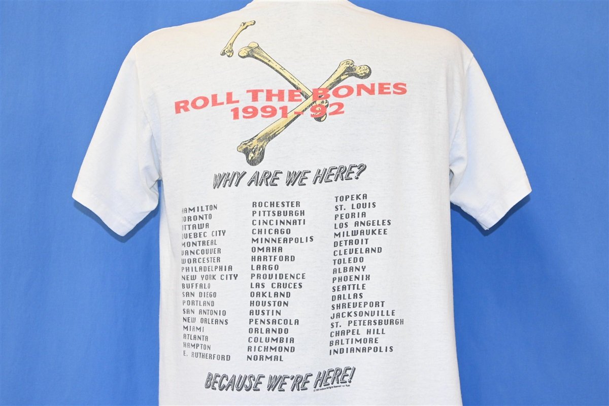 This awesome double-sided shirt commemorates the promotional tour for Rush's 1991 album Roll the Bones. This was the Canadian rock band's first studio album of the 90s, and it saw the group return to the guitar heavy sounds of their earlier releases. Roll the Bones was a commercial success that peaked at the number three spot on the Billboard 200, and in addition to the title track, the album featured the singles "Dreamline" and "Ghost of a Chance".